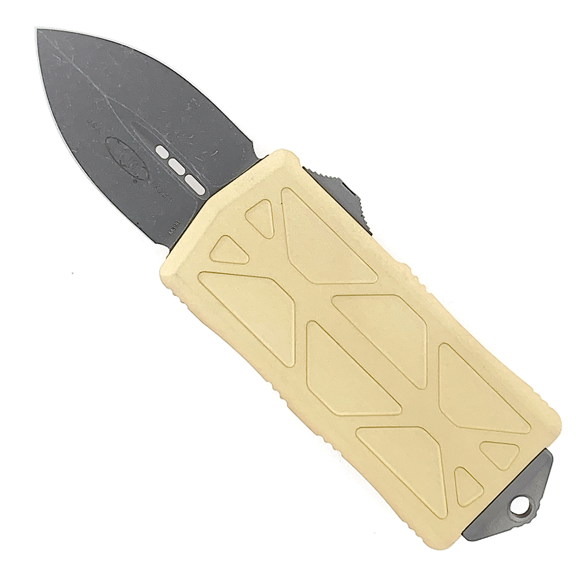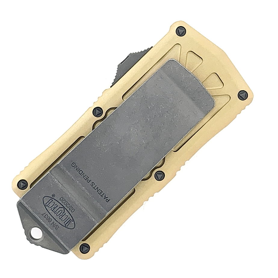 This model features champagne gold anodized 6061-T6 aluminum handle scales. Apocalyptic finished M390 stainless steel double edge dagger blade. Apocalyptic finished hardware and pocket/money clip. The blade has the Microtech logo and model information. The pocket clip has the Microtech logo, serial number, and production date. Brand new in box.