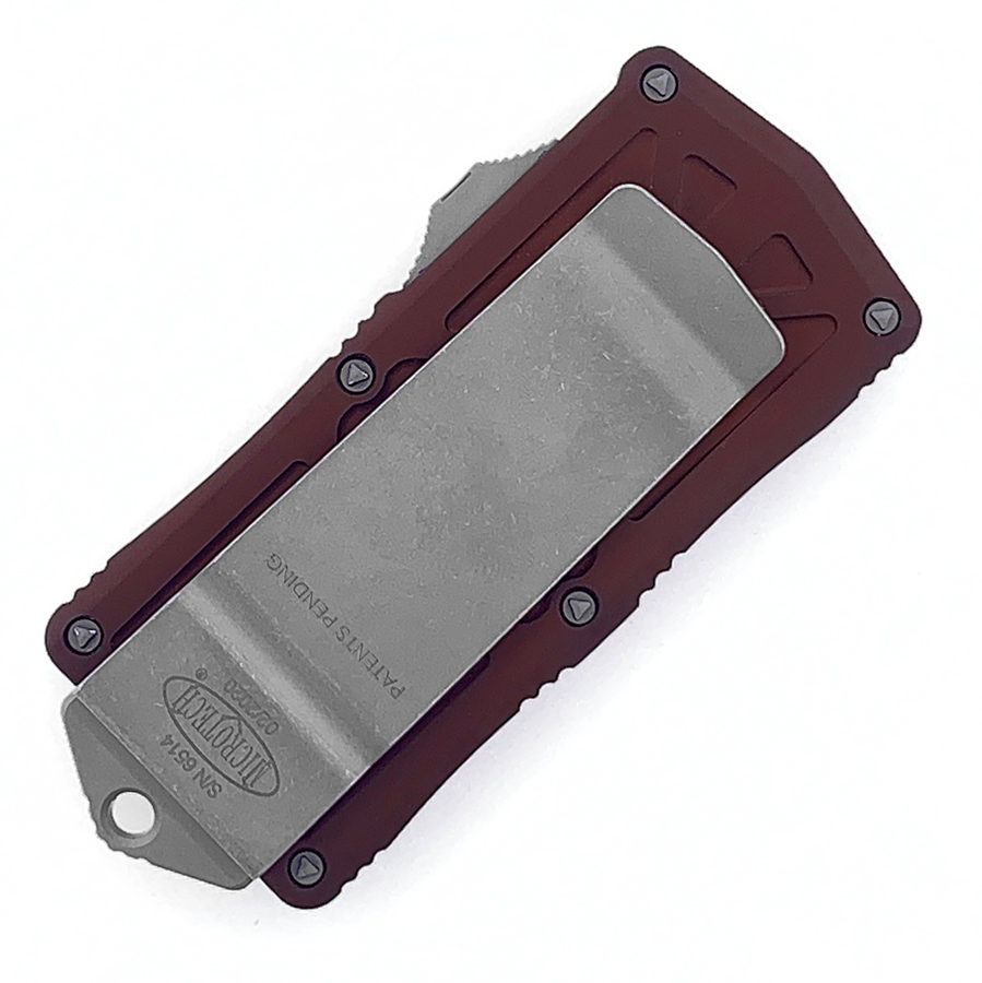 This model features merlot red anodized 6061-T6 aluminum handle scales. Apocalyptic finished M390 stainless steel double edge dagger blade. Apocalyptic finished hardware and pocket/money clip. The blade has the Microtech logo and model information. The pocket clip has the Microtech logo, serial number, and production date. Brand new in box.