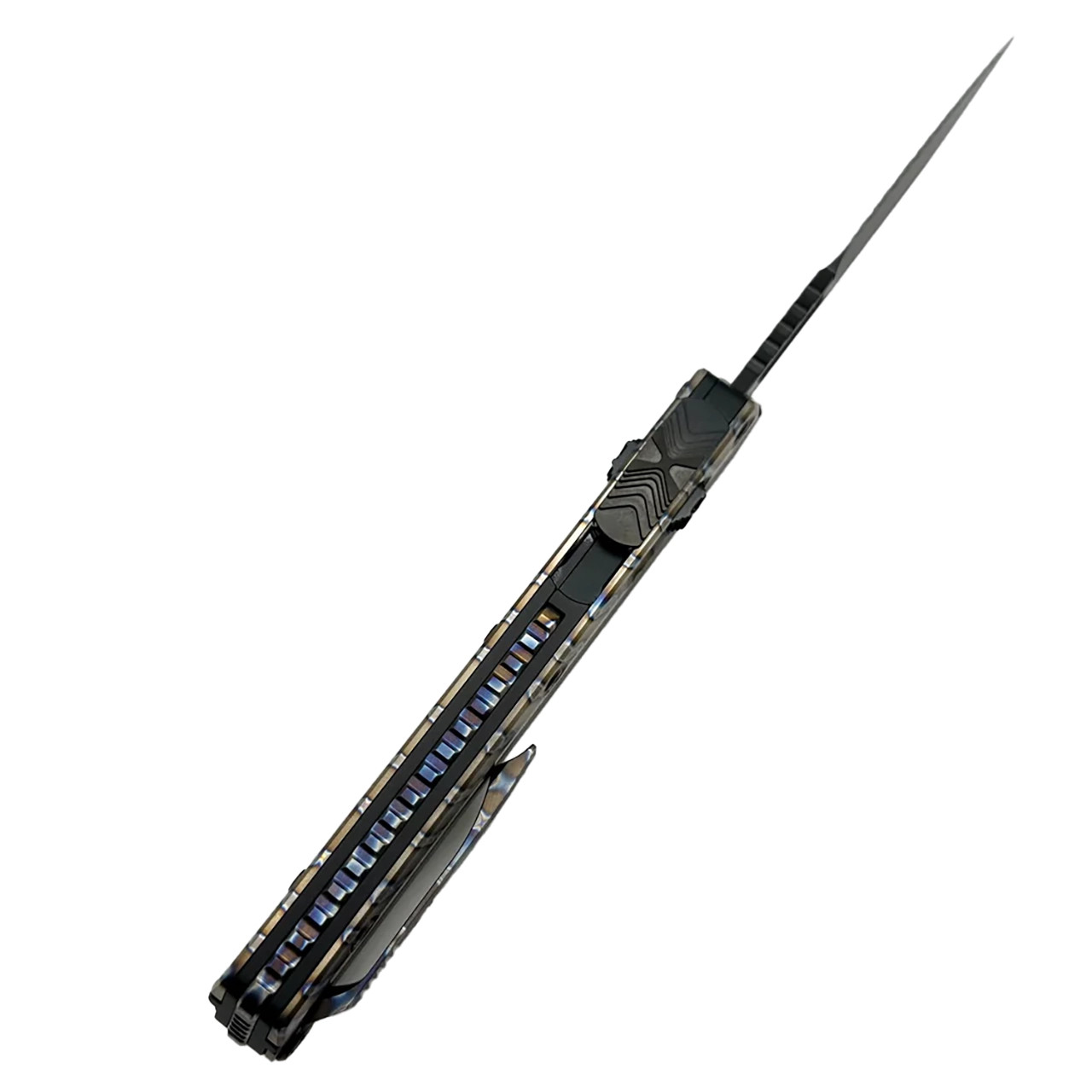 This Signature Series model has a black aluminum handle with flamed titanium inlays. Black DLC finished M390 stainless steel bayonet blade with the top edge being fully serrated. Black DLC finished hardware. Matching flamed titanium reversible pocket clip. The clip features the model information, Signature Series logo, serial number and production date all deep engraved. The blade has the Microtech claw logo ghosted in the fuller. Brand new in box.