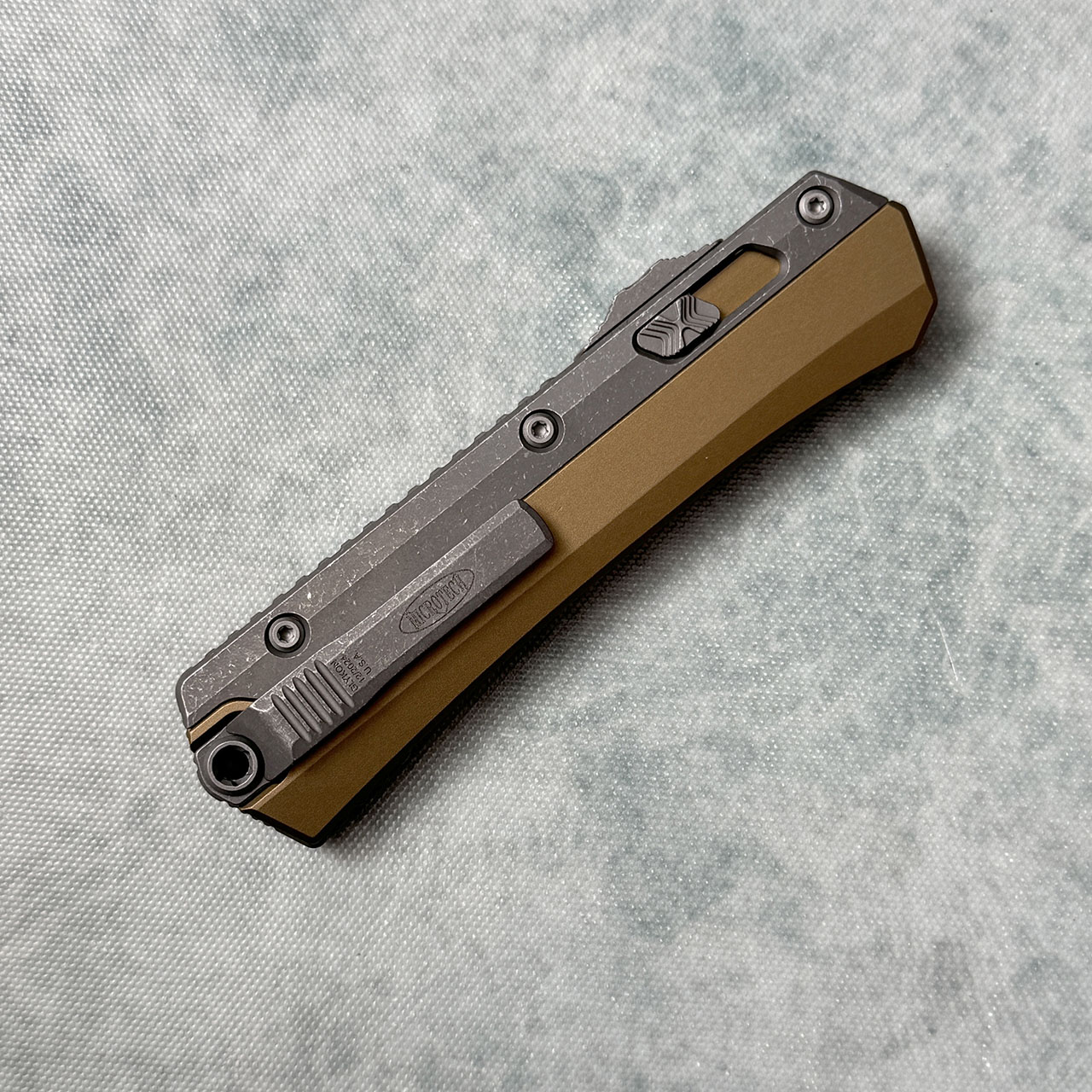 This model has Tan/apocalyptic anodized 6061-T6 aluminum handle. Apocalyptic finished M390 stainless steel bayonet blade with standard cutting edges. Apocalyptic finished hardware, reversible pocket clip, and lanyard hole. The clip features the model information, Microtech logo, and production date all deep engraved. Brand new in box.