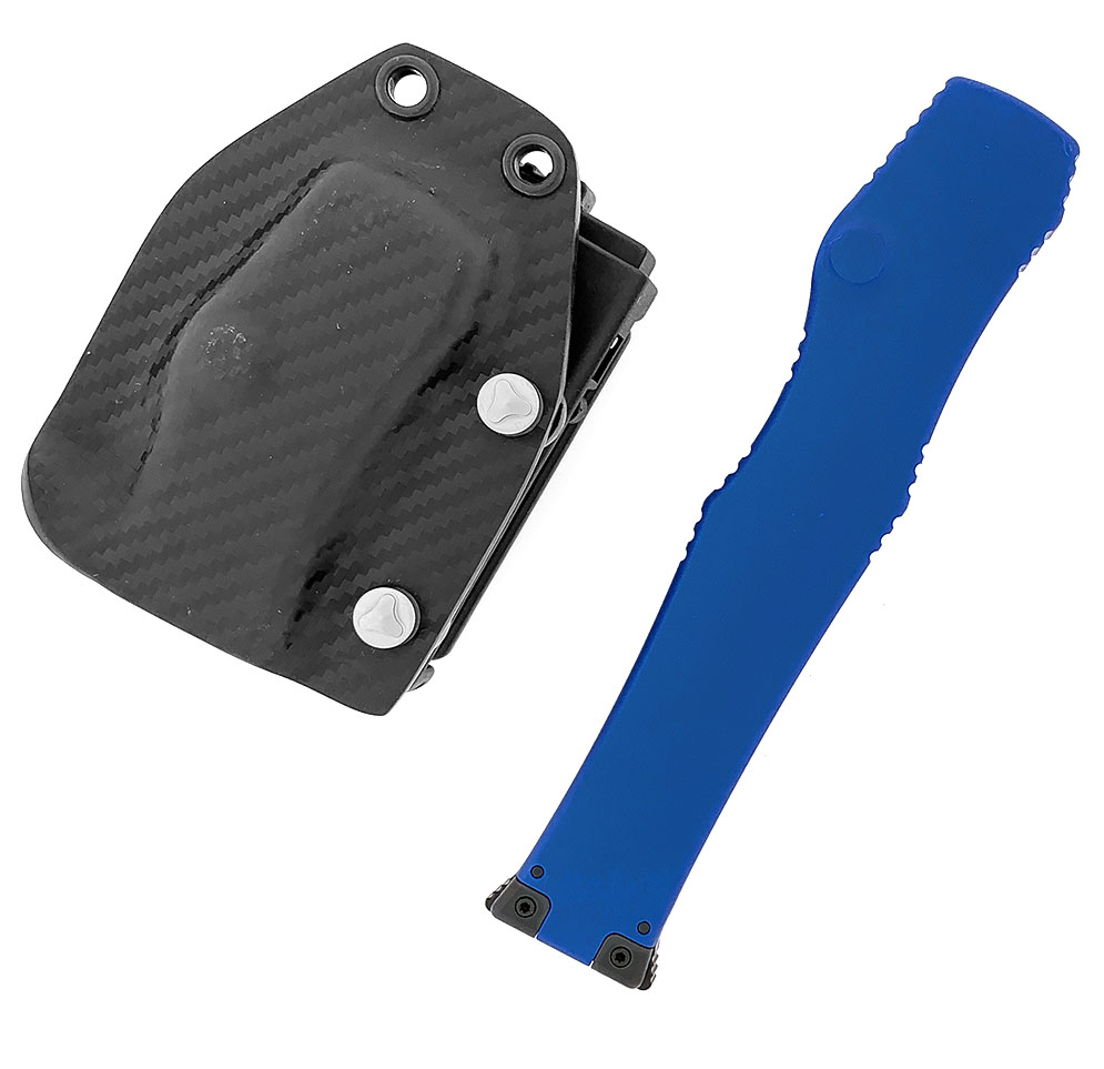 This limited edition signature series model features a blue anodized 6061-T6 aluminum handle. Black DLC finished M390 stainless steel tanto blade with a standard edge. Black DLC finished hardware and charging bar. The front of the handle features the Microtech Claw logo. The blade has the Microtech logo and model information. The charging bar has the Signature Series logo, model information, production date, and serial number. Brand new in box with kydex tactical sheath.