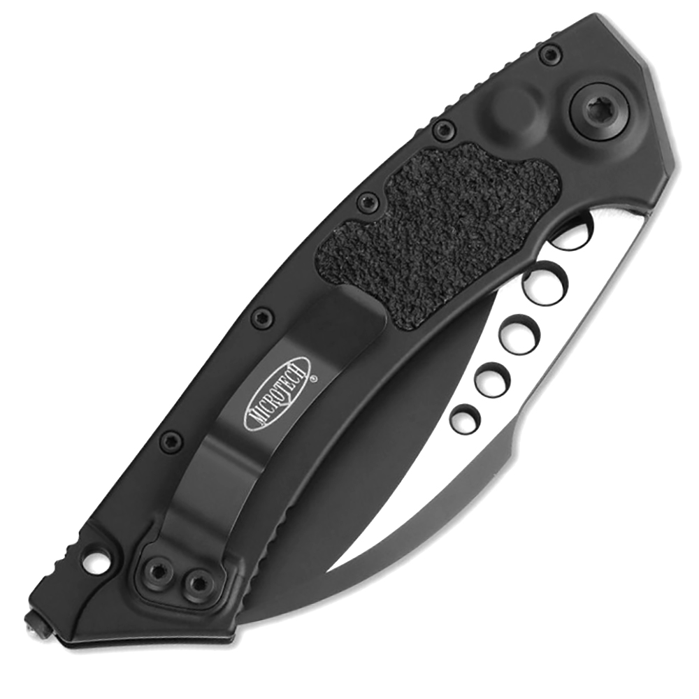 This model features a black anodized 6061-T6 aluminum handle with grip inserts. Two tone black and satin finished M390 stainless steel hawkbill karambit style blade. All black tactical finished hardware, glass breaker, and pocket clip. The pocket clip is marked with the Microtech logo. The blade is marked with the Microtech logo, model information, production date, and serial number. Brand new in box.