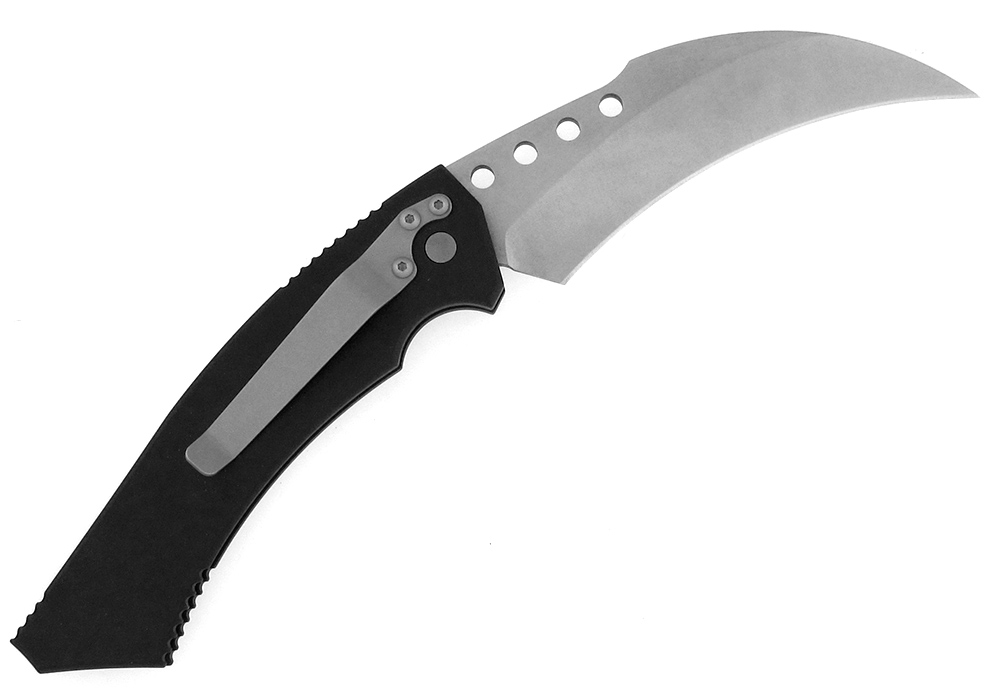 This is the original model. A true collector's piece waiting. Anodized aluminum handle has ridges on top and lower botton with a finger indent for added grip. Removable pocket clip for tip down carry or Molle Sheath carry. Stonewashed 14-4CrMo stainless steel hawk bill blade. Four blade blood drain holes in the blade balance the knife. This is one very fine, precision, switch-blade knife that really hits hard. Made in May of 2002. Serial numbered # 0357. New with Microtech nylon sheath.
