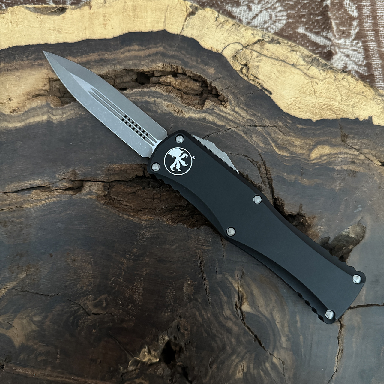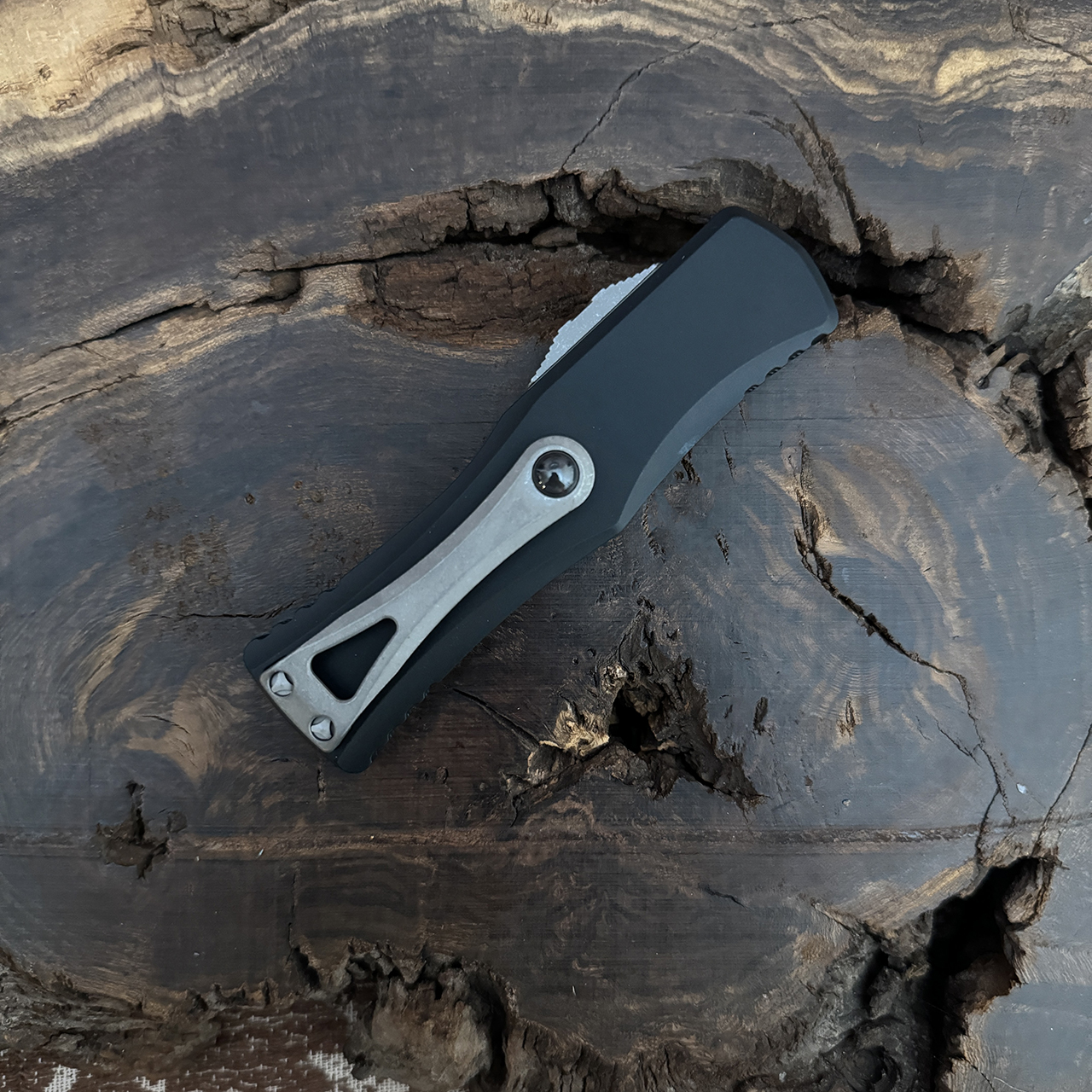 The Hera from Microtech knives is a stunning double action OTF knife. It features a symmetrical handle shape with excellent ergonomics. The frag pattern machined textured areas near the end of both sides of the frame enhance grip and add something great to the overall style. This knife is stylish and the perfect size for everyday carry. Smooth and strong action. A large milled rollerball clip and double blade fullers round out this package and make it stand out in a crowded field of OTF offerings!