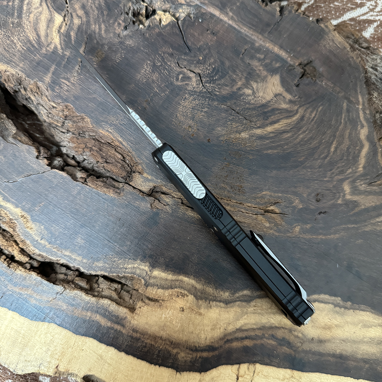 The Microtech Mini Hera II sets a higher standard for the perfect blend of aesthetic and utility that was introduced by the original Hera. Smaller than both the origianl hera and the Hera II, the mini Hera II has a streamlined design of the original with dramatic improvements. Redesigned 6AL4V pocket clip and glass breaker. The ultra-smooth action of the reengineered dual fuel drivetrain allows for effortless deployment, and the innovative button pocket design reduces friction and facilitates debris displacement. The size and practicality of the mini Hera II combined with its updated style and functionality make this the perfect addition to your everyday carry.