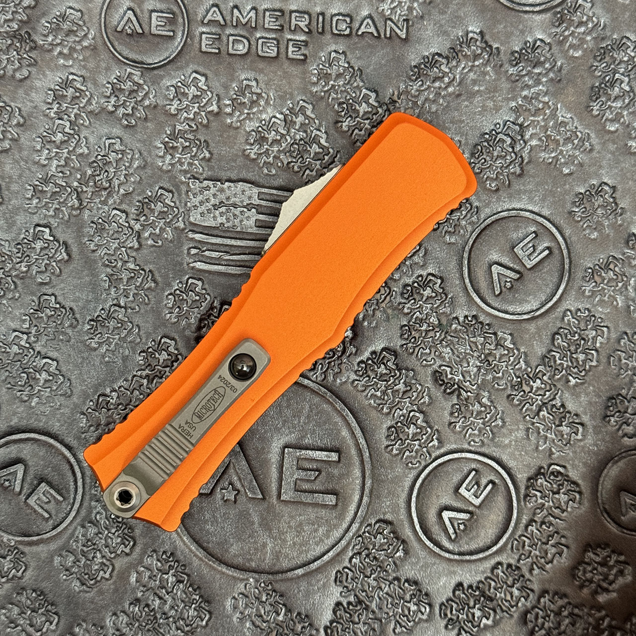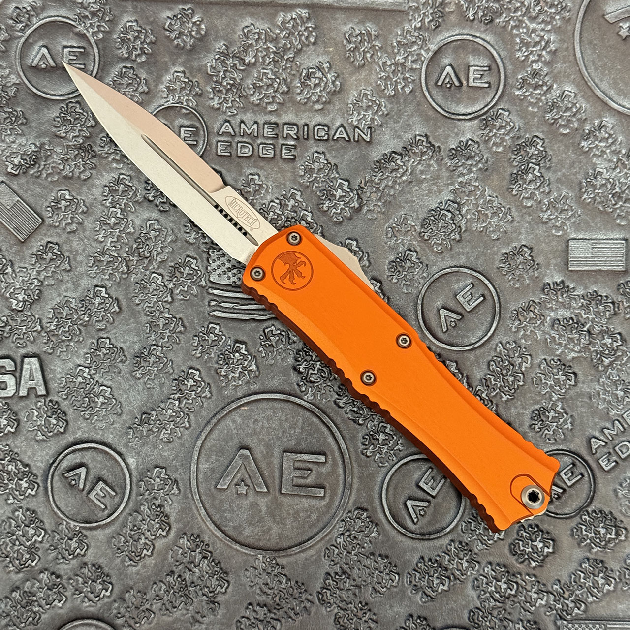 This model features an orange handle and stonewash Bohler-M390MK stonewash finished dagger blade with standard edges. Silica Carbide roller ball clip. The blade is marked with the Microtech logo. The clip is marked with Microtech logo, model info, and production date. Brand new in box.