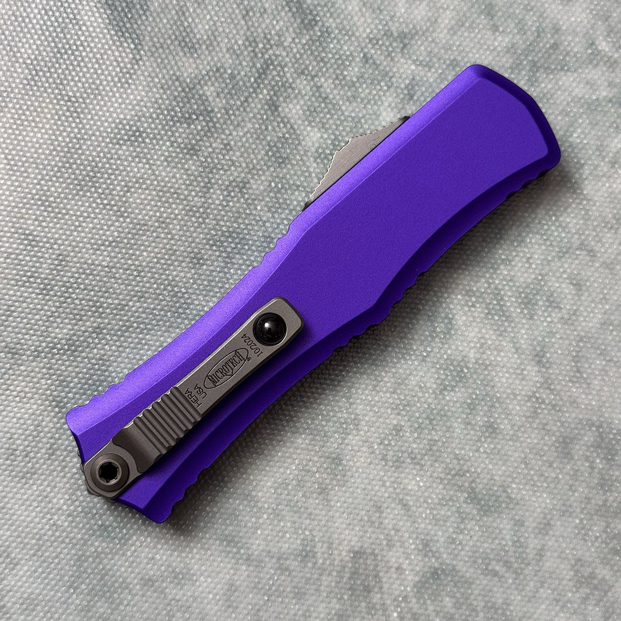 This model features an purple handle and satin Bohler-M390MK finished dagger blade with standard edges. Silica Carbide roller ball clip. The blade is marked with the Microtech logo. The clip is marked with Microtech logo, model info, and production date. Brand new in box.