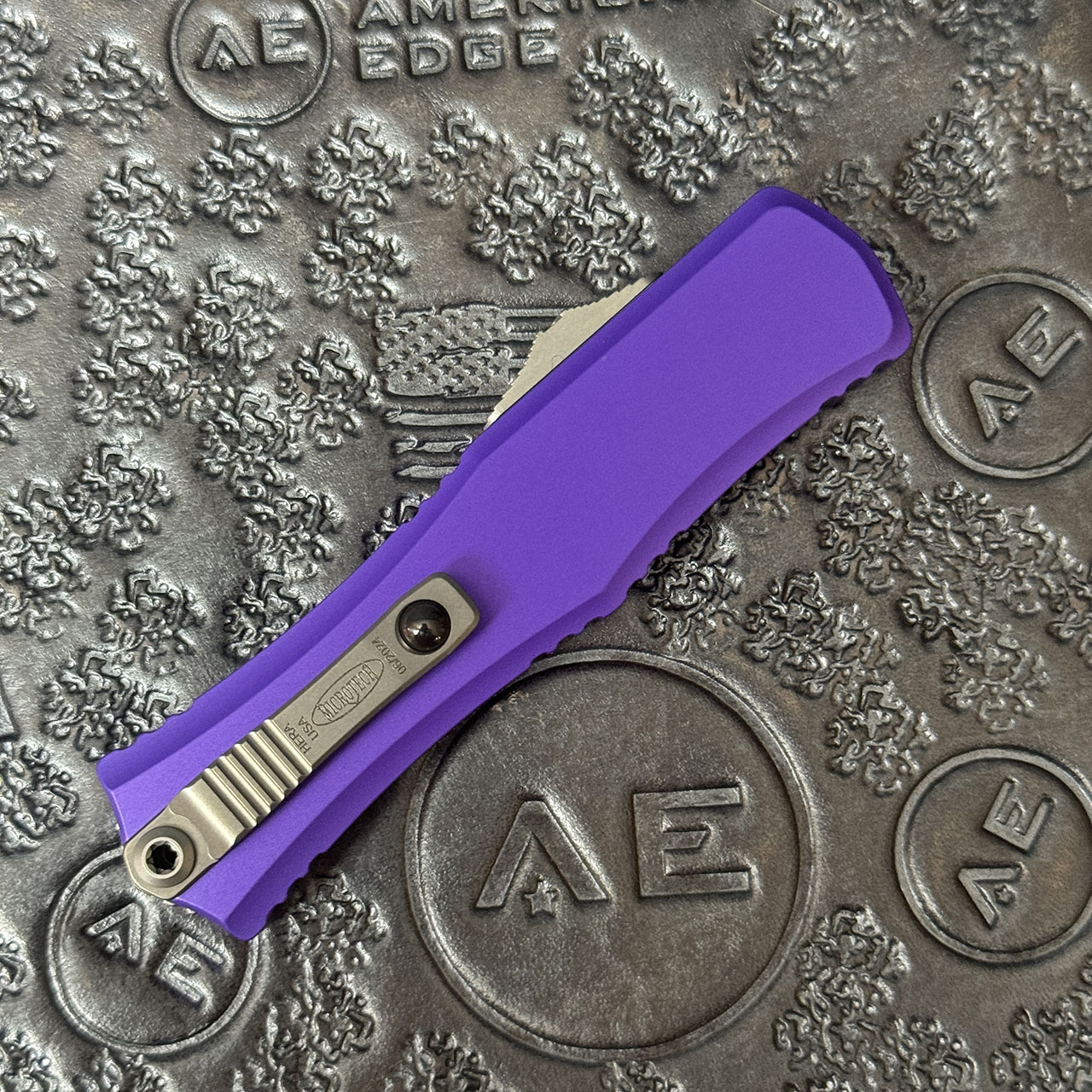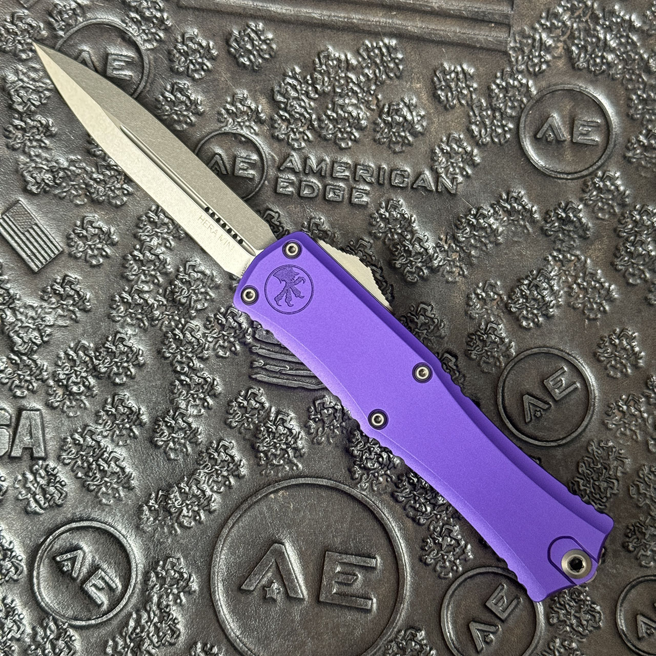 This model features a purple handle and stonewash Bohler-M390MK finished dagger blade with standard edges. Silica Carbide roller ball clip. The blade is marked with the Microtech logo. The clip is marked with Microtech logo, model info, and production date. Brand new in box.
