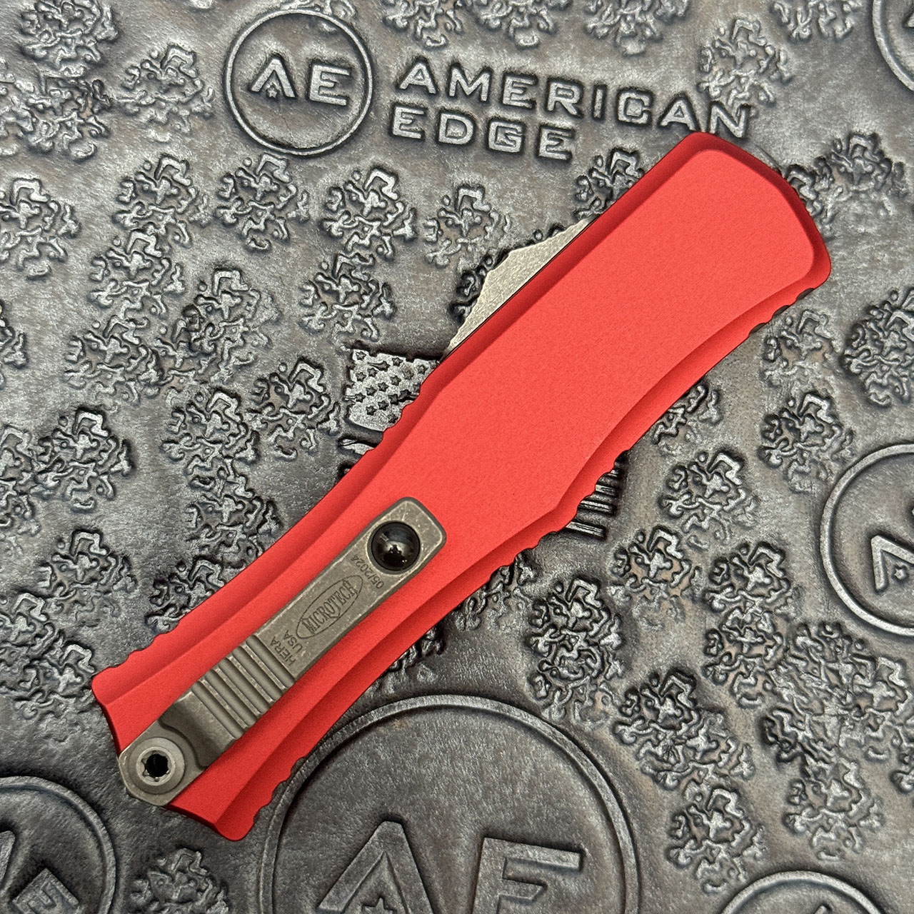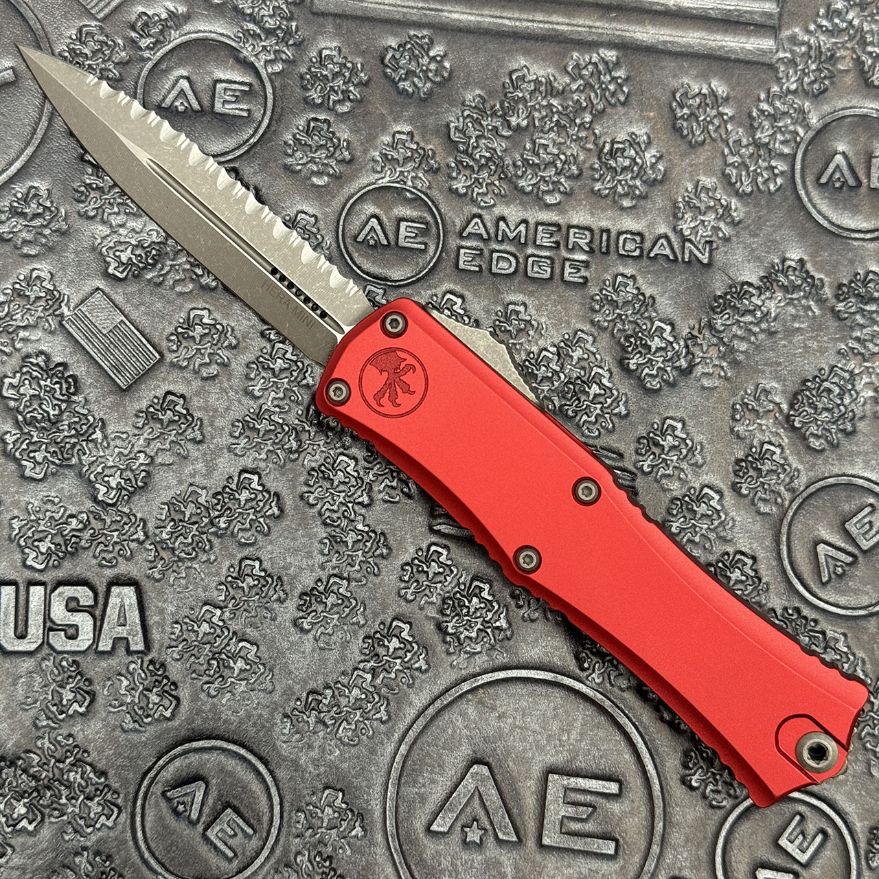 This model features a red handle and apocalyptic Bohler-M390MK finished dagger blade with partially serrated cutting edge. Silica Carbide roller ball clip. The blade is marked with the Microtech logo. The clip is marked with Microtech logo, model info, and production date. Brand new in box.