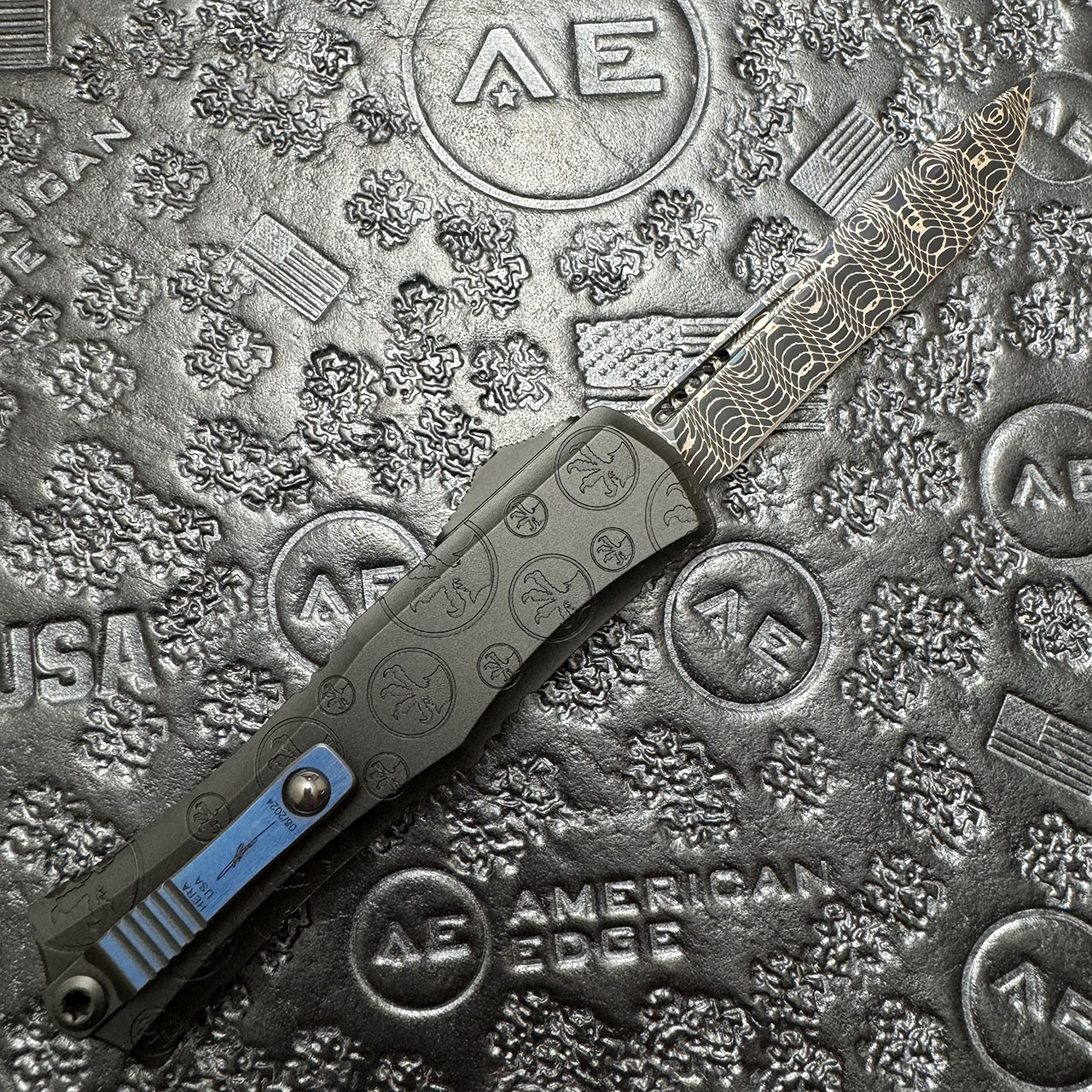This limited model features a black claw burst deep engraved handle with blue titanium hardware and vegas forge blued spirograph damascus single edge recurve blade. Silica Carbide roller ball clip. The blade is marked with the Microtech logo. The clip is marked with Microtech logo, model info, serial number, and production date. Brand new in box.