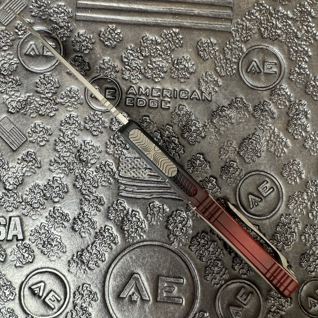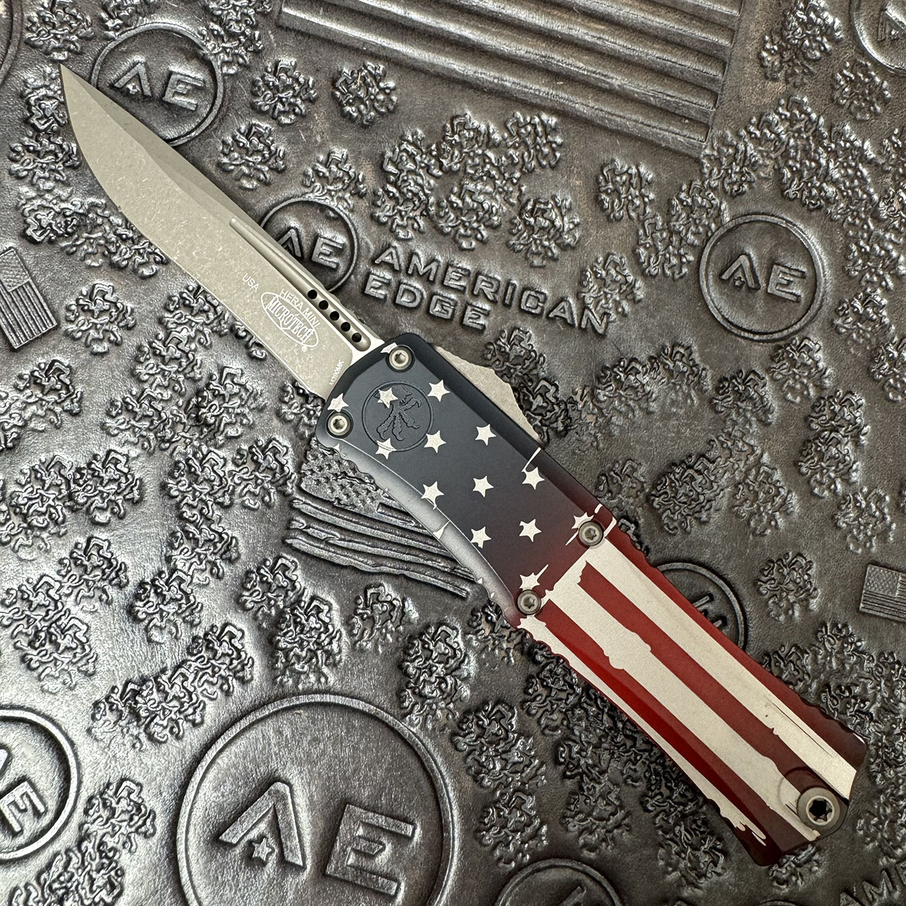 This model features a USA flag cerakote handle and apocalyptic finished Bohler-M390MK recurve S/E blade. Silica Carbide roller ball clip. The blade is marked with the Microtech logo. The clip is marked with Microtech logo, model info, serial number, and production date. Brand new in box.