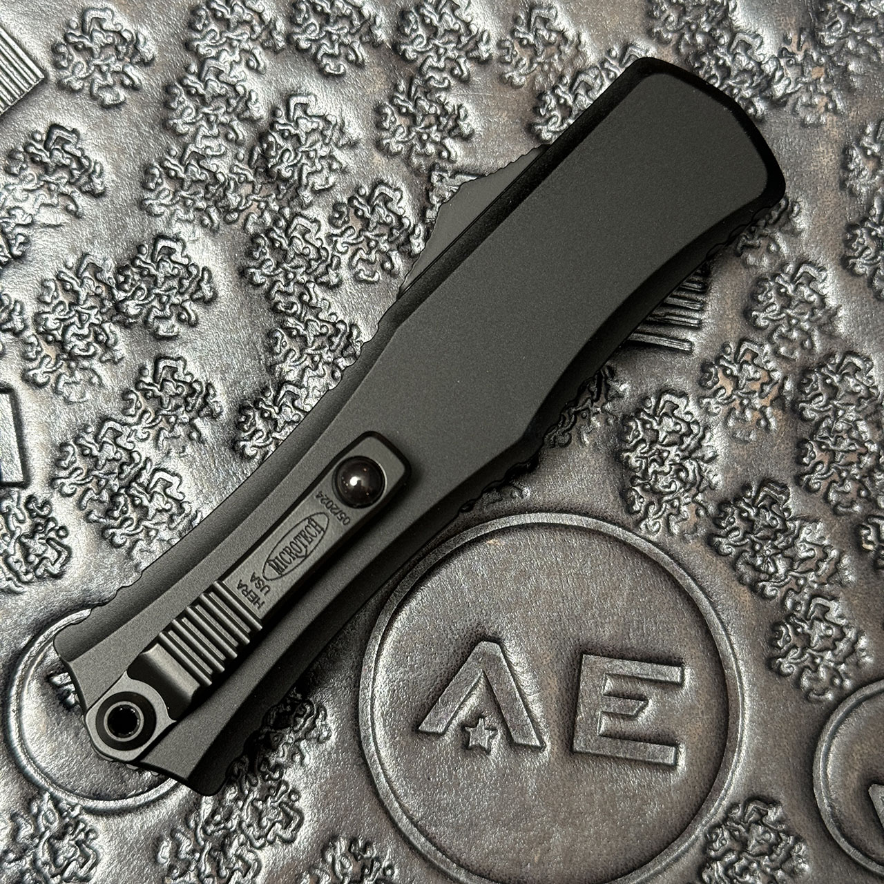 This tactical model features a black handle and black Bohler-M390MK recurve S/E blade. Silica Carbide roller ball clip. The blade is marked with the Microtech logo. The clip is marked with Microtech logo, model info, and production date. Brand new in box.