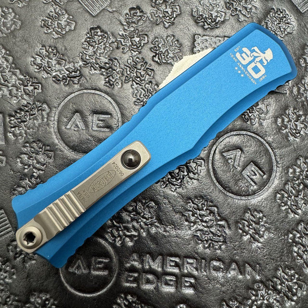 This model features a blue handle and stonewash Bohler-M390MK stonewash finished S/E blade. Silica Carbide roller ball clip. The blade is marked with the Microtech logo. The clip is marked with Microtech logo, model info, and production date. The back handle has the 30th anniversary logo. Brand new in box.