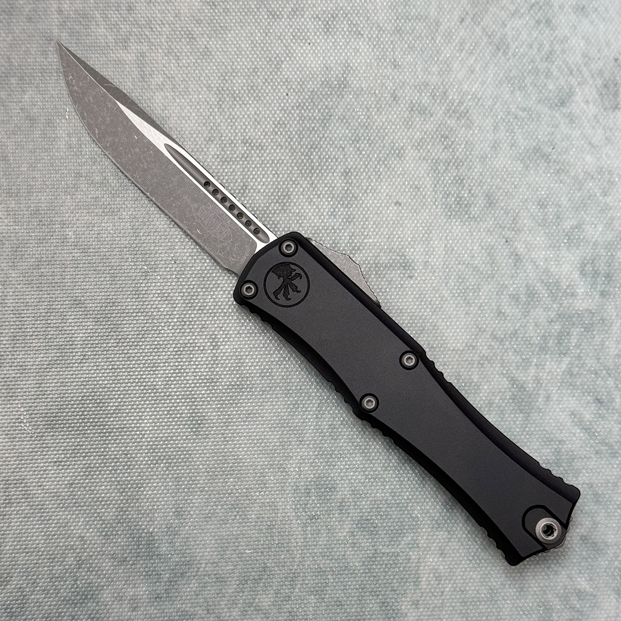 This model features a black handle and apocalyptic Bohler-M390MK apocalyptic finished S/E blade. Silica Carbide roller ball clip. The blade is marked with the Microtech logo. The clip is marked with Microtech logo, model info, and production date. Brand new in box.
