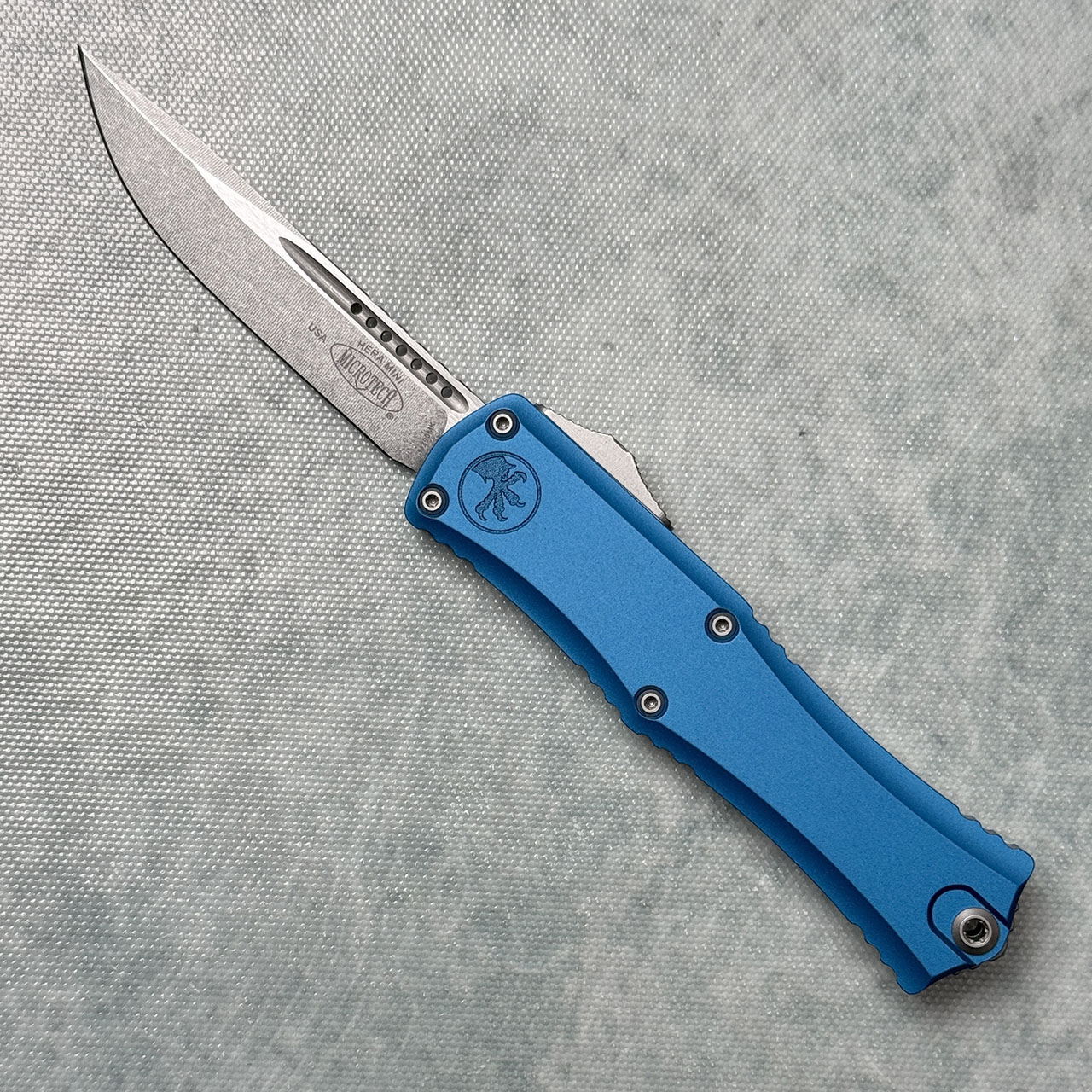 This model features a blue handle and stonewash Bohler-M390MK stonewash finished S/E blade. Silica Carbide roller ball clip. The blade is marked with the Microtech logo. The clip is marked with Microtech logo, model info, and production date. Brand new in box.