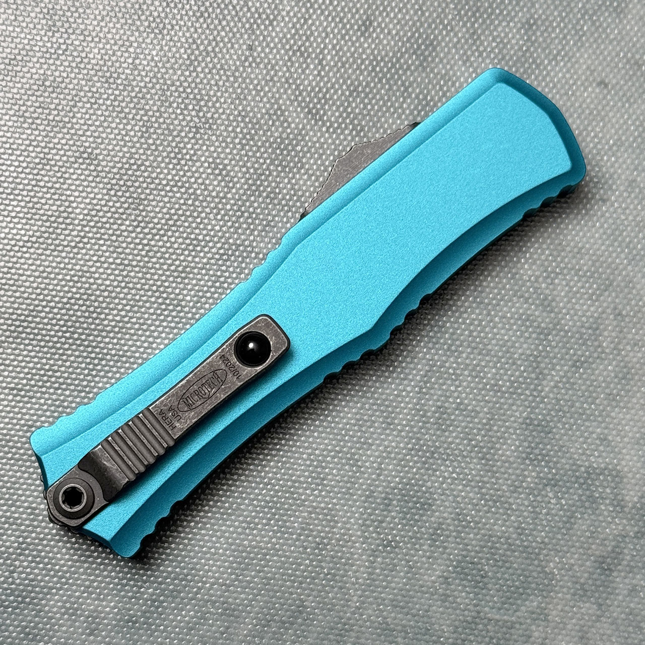 This model features a turquoise handle and apocalyptic Bohler-M390MK stonewash finished S/E blade. Silica Carbide roller ball clip. The blade is marked with the Microtech logo. The clip is marked with Microtech logo, model info, and production date. Brand new in box.
