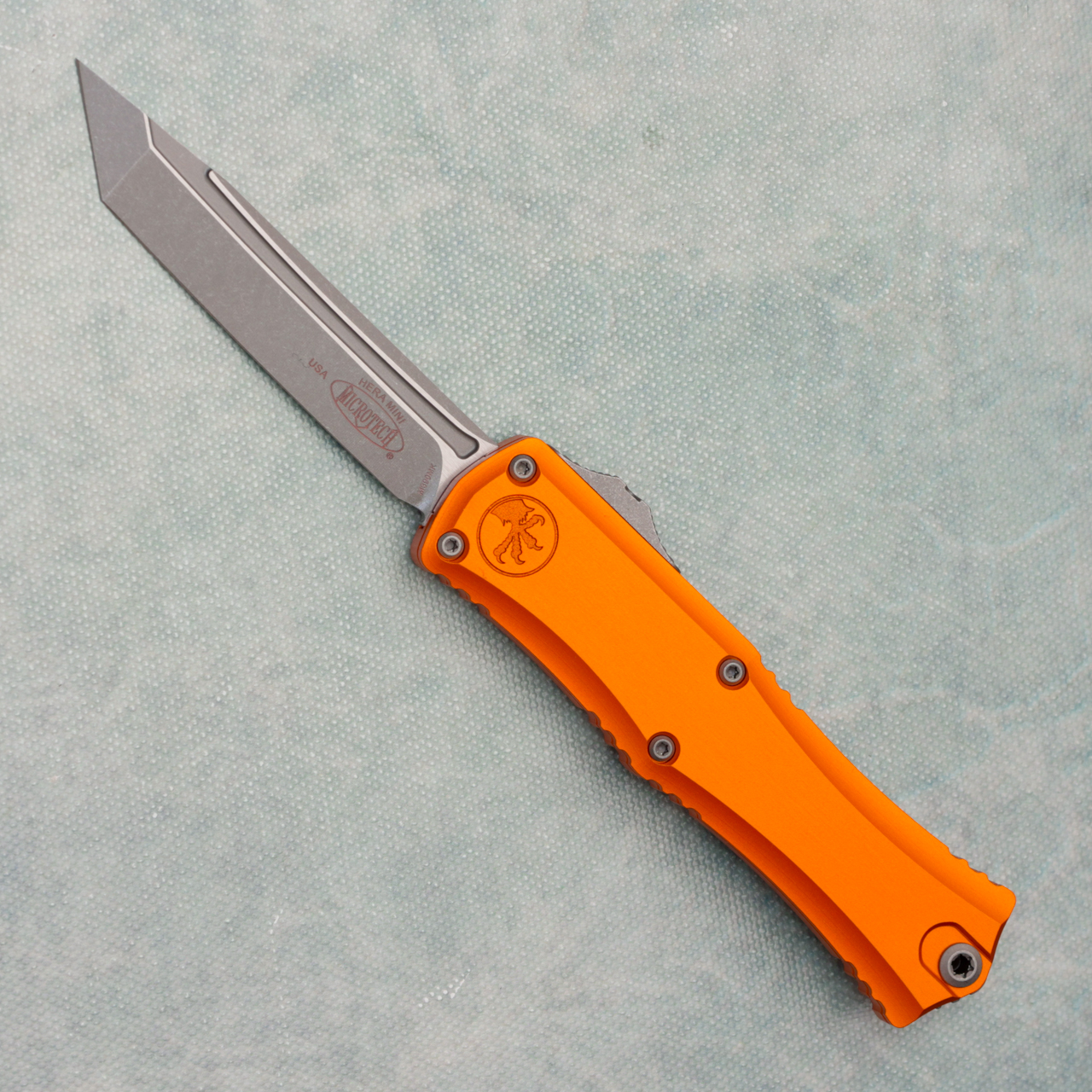 This model features a orange handle and apocalyptic Bohler-M390MK tanto blade. Silica Carbide roller ball clip. The blade is marked with the Microtech logo. The clip is marked with Microtech logo, model info, and production date. Brand new in box.