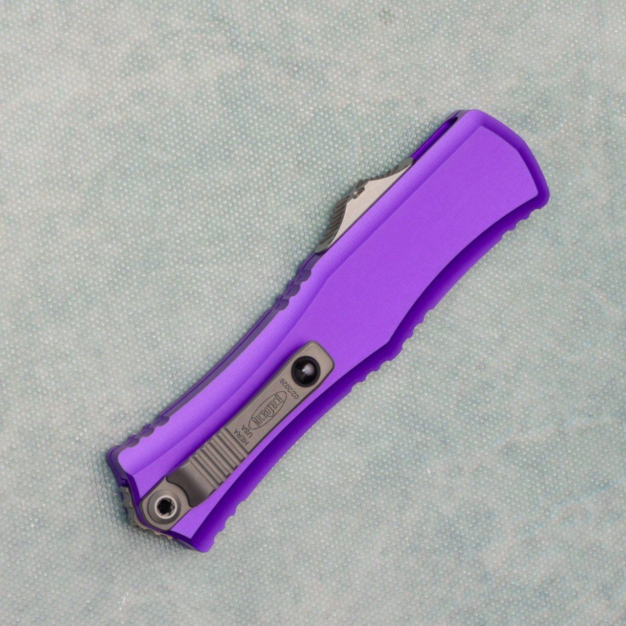 This model features a purple handle and Bohler-M390MK stonewash finished tanto blade. Silica Carbide roller ball clip. The blade is marked with the Microtech logo. The clip is marked with Microtech logo, model info, and production date. Brand new in box.