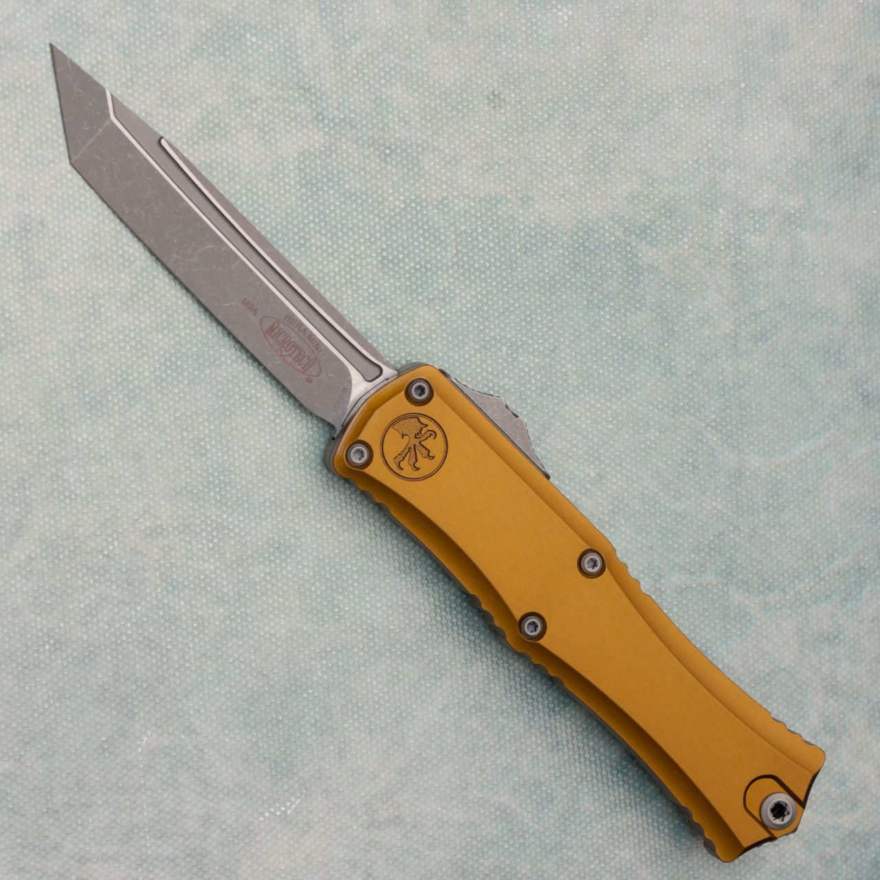 This model features a tan handle and apocalyptic Bohler-M390MK tanto blade. Silica Carbide roller ball clip. The blade is marked with the Microtech logo. The clip is marked with Microtech logo, model info, and production date. Brand new in box.