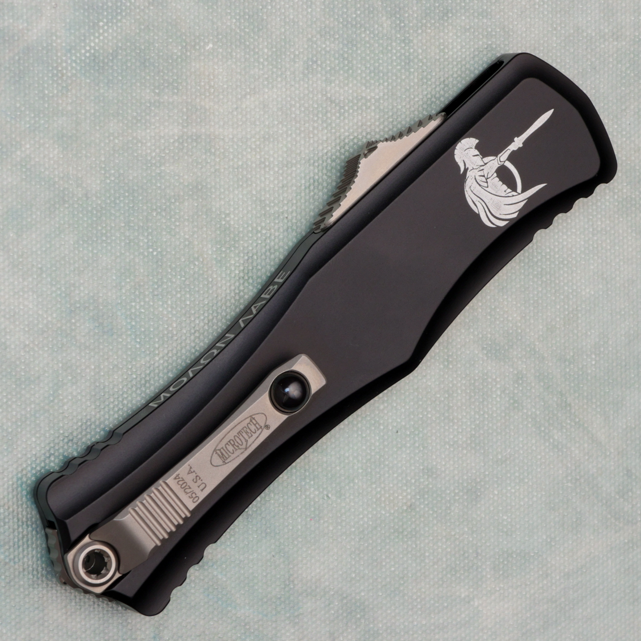 This model features a black handle and Bohler-M390MK stonewash finished recurve S/E blade. Silica Carbide roller ball clip. The blade is marked with the Microtech logo and model info. The clip is marked with Microtech logo, and production date. We engraved this one in house with a spartan theme. Brand new in box.
