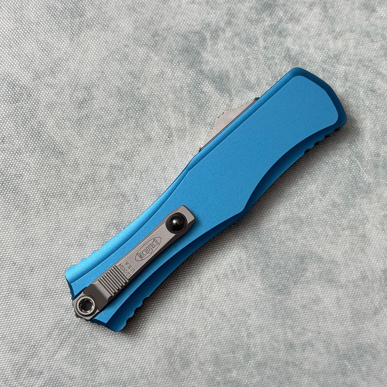 This model features a blue handle and Bohler-M390MK satin finished recurve S/E blade. Silica Carbide roller ball clip. The blade is marked with the Microtech logo and model info. The clip is marked with Microtech logo, and production date. Brand new in box.