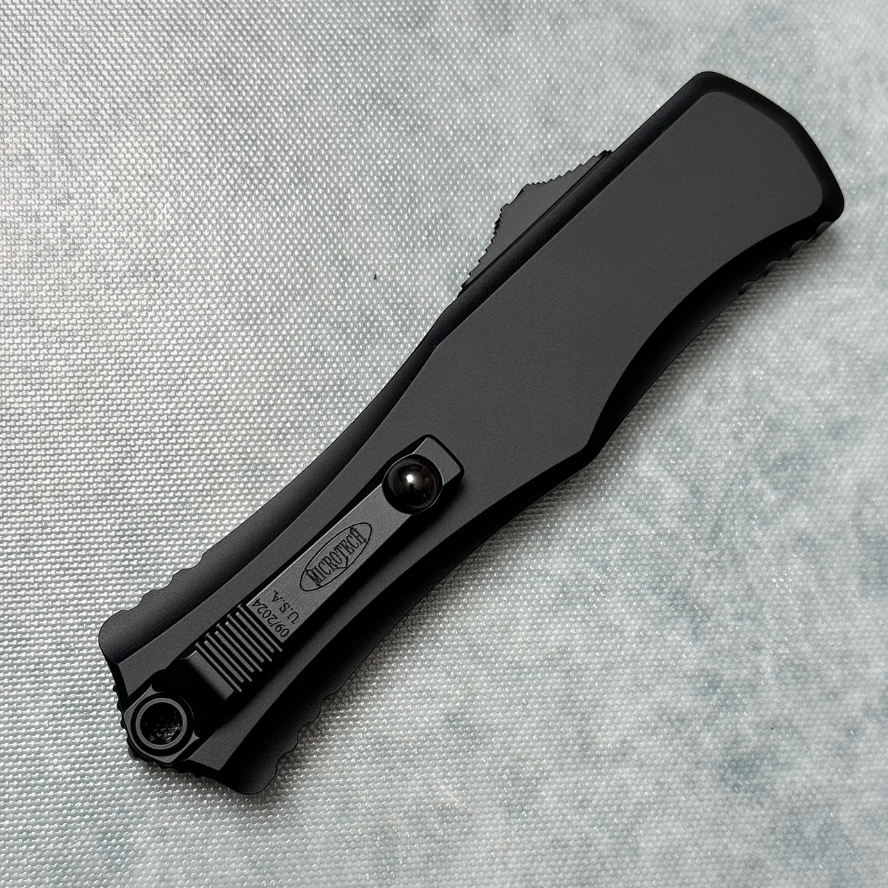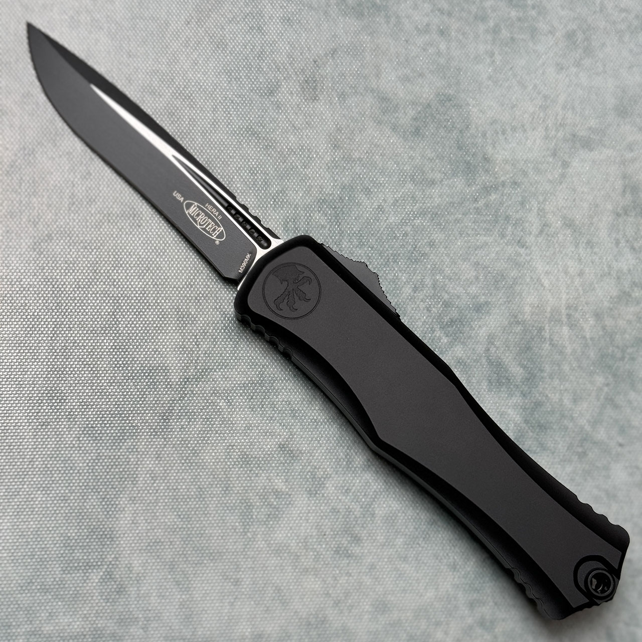 This model features a black handle and Bohler-M390MK black recurve S/E blade. Silica Carbide roller ball clip. The blade is marked with the Microtech logo and model info. The clip is marked with Microtech logo, and production date. Brand new in box.