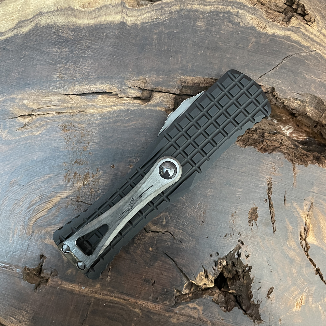 The Hera from Microtech knives is a stunning double action OTF knife. It features a symmetrical handle shape with excellent ergonomics. The frag pattern machined textured areas near the end of both sides of the frame enhance grip and add something great to the overall style. This knife is stylish and the perfect size for everyday carry. Smooth and strong action. A large milled rollerball clip and double blade fullers round out this package and make it stand out in a crowded field of OTF offerings!