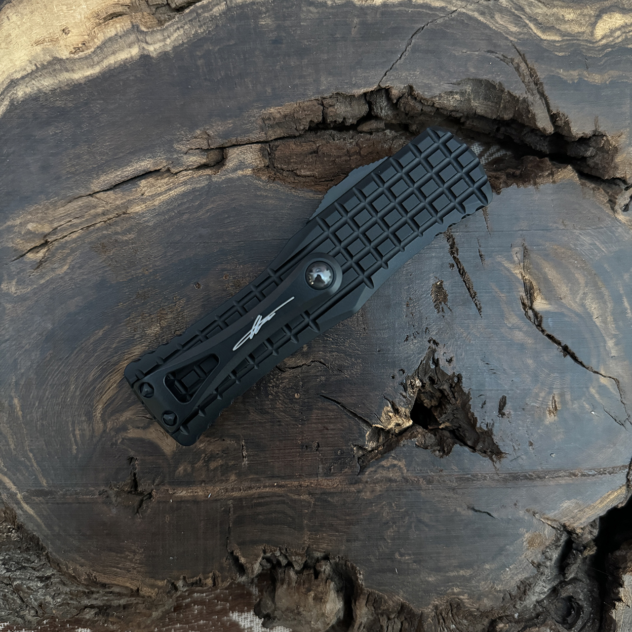 The Hera from Microtech knives is a stunning double action OTF knife. It features a symmetrical handle shape with excellent ergonomics. The frag pattern machined textured areas near the end of both sides of the frame enhance grip and add something great to the overall style. This knife is stylish and the perfect size for everyday carry. Smooth and strong action. A large milled rollerball clip and double blade fullers round out this package and make it stand out in a crowded field of OTF offerings!