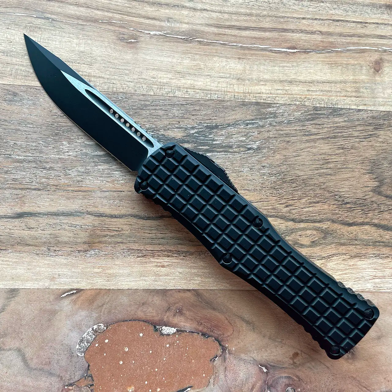 The Hera from Microtech knives is a stunning double action OTF knife. It features a symmetrical handle shape with excellent ergonomics. The frag pattern machined textured areas near the end of both sides of the frame enhance grip and add something great to the overall style. This knife is stylish and the perfect size for everyday carry. Smooth and strong action. A large milled rollerball clip and double blade fullers round out this package and make it stand out in a crowded field of OTF offerings!
