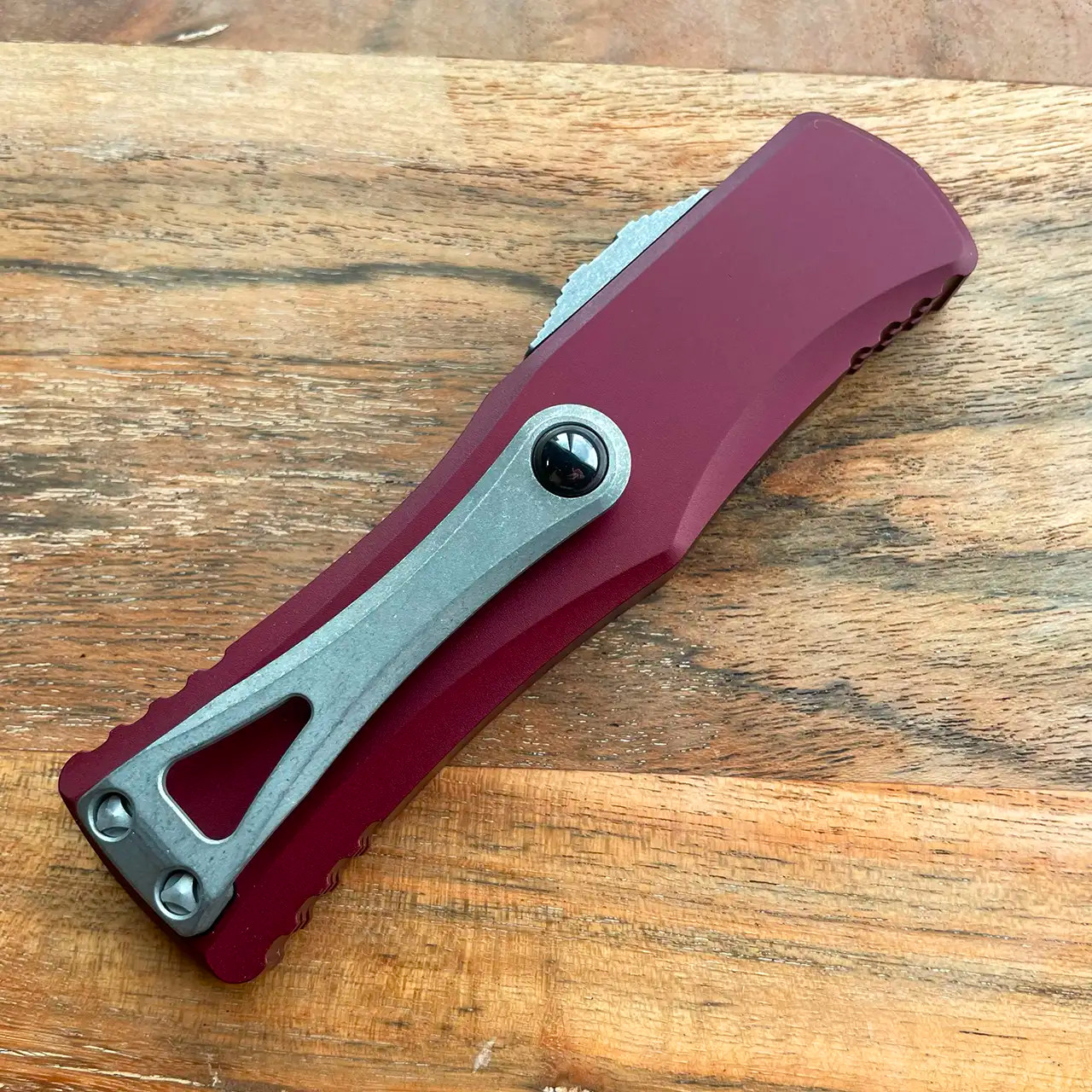 This model features a merlot anodized 6061-T6 aluminum handle. Apocalyptic finished M390* stainless steel single edge drop point blade. Bead Blasted roller ball pocket clip and headware. The front of the handle features the Microtech claw logo. The side is etched with model information, serial number, and production date. Brand new in box.