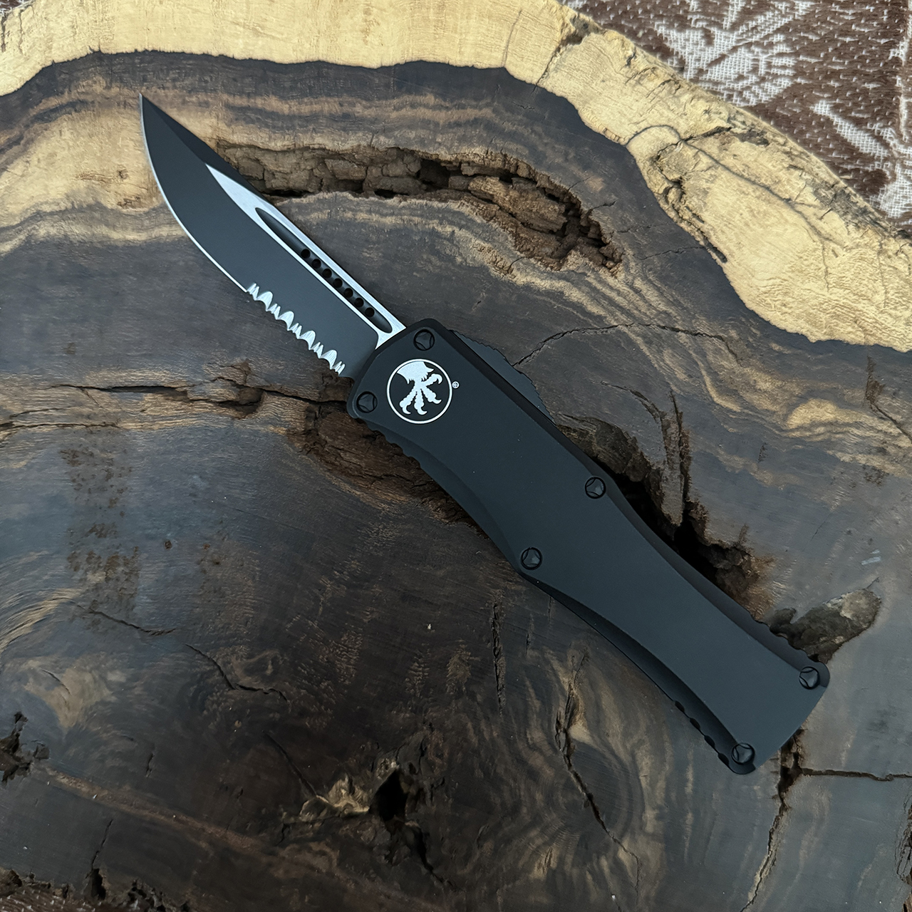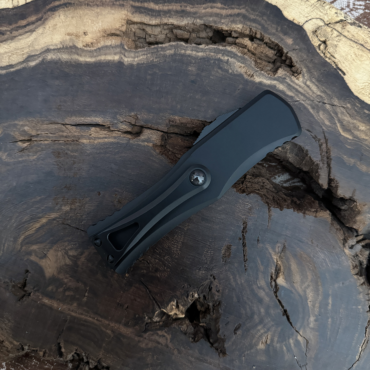 This model features a black tactical anodized 6061-T6 aluminum handle with deep engraved with the Microtech Claw logo. Black finished M390 stainless steel single edge clip point partially serrated blade. Black finished hardware and black roller ball pocket clip. Brand new in box.