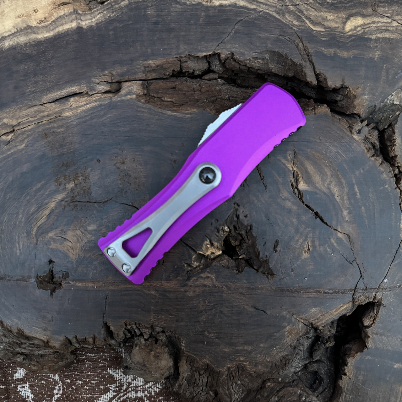 This model features a violet anodized 6061-T6 aluminum handle. Stonewash finished M390 stainless steel single edge drop point blade. Bead blasted roller ball pocket clip and headware. The front of the handle features the Microtech claw logo. The side is etched with model information, serial number, and production date. Brand new in box.