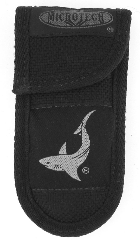 Awesome lightweight carbon fiber handle scales with grey anodized aircraft aluminum bolsters. Black finished 154-CM high carbon stainless steel modified clip point blade. This knife is a double action which means the blade can be opened manually or with the hidden bolster release. The bolster slides slightly and the blade snaps out. Bead blasted liners and removable pocket clip with shark logo. There is a bar in the bottom of the handle where a lanyard can be easily attached. Serial number #0748. Born October 2000. Near mint condition, has one minor rub mark on blade finish. Comes in box with original paperwork and sheath.