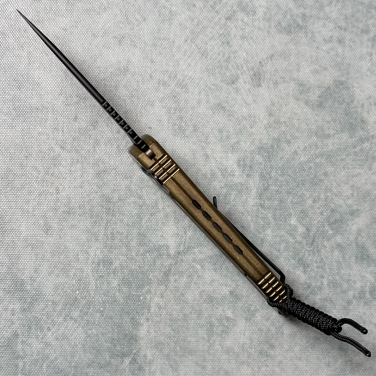 This model has brass handle scales. Black finished M390 stainless steel drop point blade. Black finished hardware and pocket clip. Lanyard hole with lanyard. The blade is marked with the model information and Microtech logo. The pocket clip is also marked with the Microtech logo. An excellent choice for an EDC! Pre-owned in box, blade looks good, just patina on brass handle.