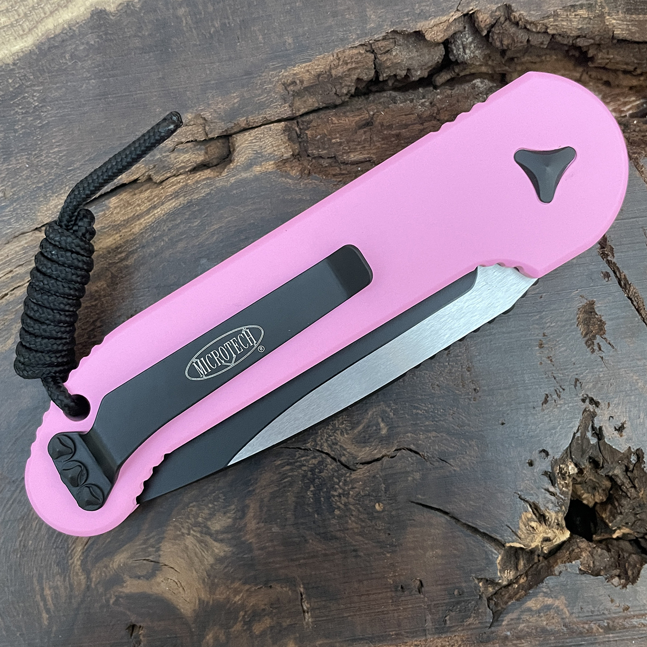 This model has a smooth chassis Cerakote pink finished aluminum handle. Black finished M390 stainless steel drop point blade with a standard cutting edge. Lanyard hole with nylon lanyard. Black finished hardware and pocket clip. The blade is marked with the model information and Microtech logo. The pocket clip is also marked with the Microtech logo. Brand new in box.