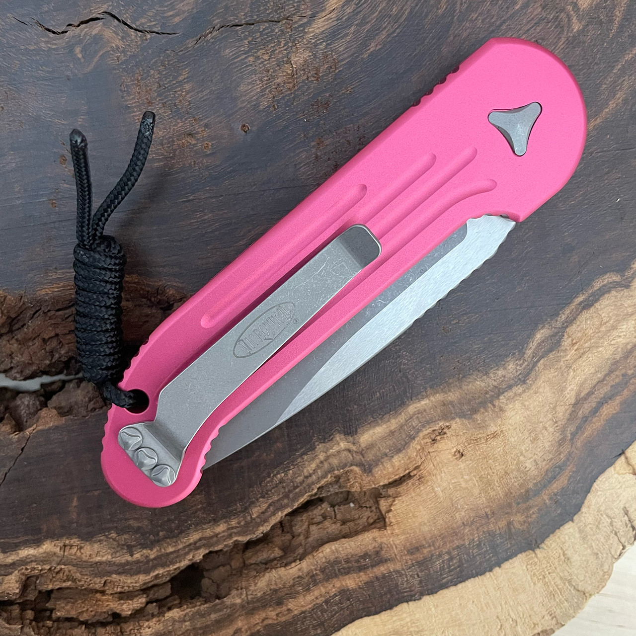 This model features a grooved pink anodized 6061-T6 aluminum handle. Apocalyptic finished ELMAX stainless steel drop point blade. Lanyard hole with nylon lanyard. Bead blasted hardware and pocket clip. The blade is marked with the model information and Microtech logo. The pocket clip is also marked with the Microtech logo. Brand new in box.