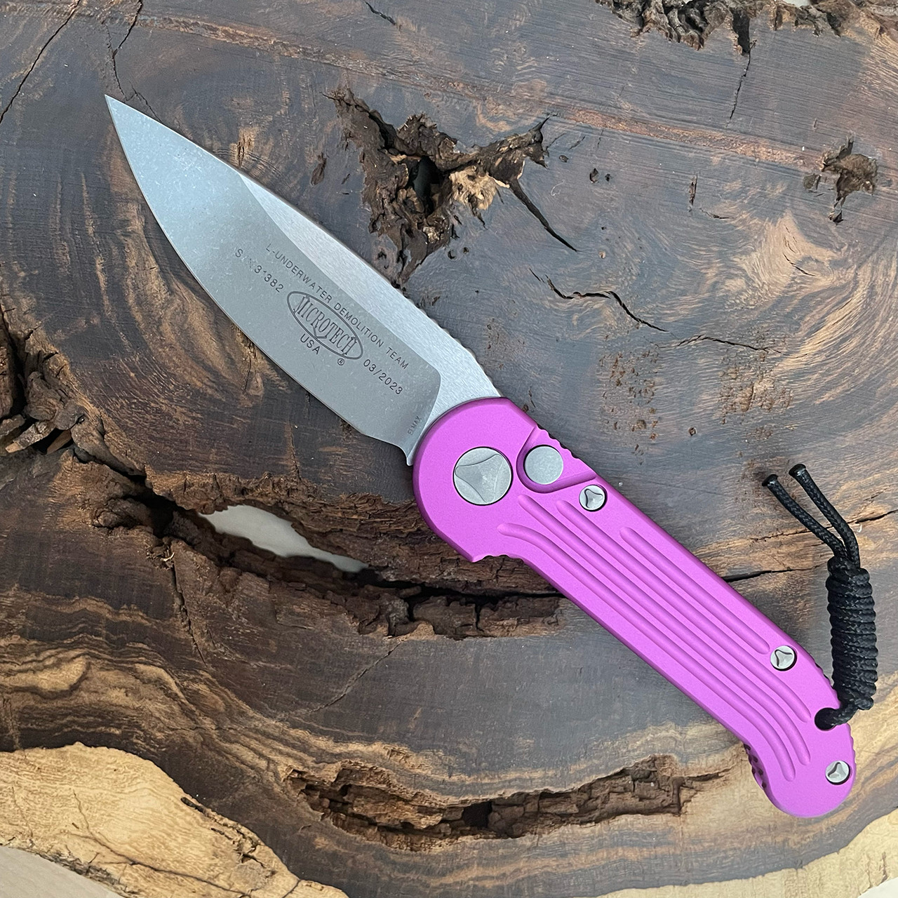 This model features a grooved violet anodized 6061-T6 aluminum handle. Apocalyptic finished ELMAX stainless steel drop point blade. Lanyard hole with nylon lanyard. Bead blasted hardware and pocket clip. The blade is marked with the model information and Microtech logo. The pocket clip is also marked with the Microtech logo. Brand new in box.