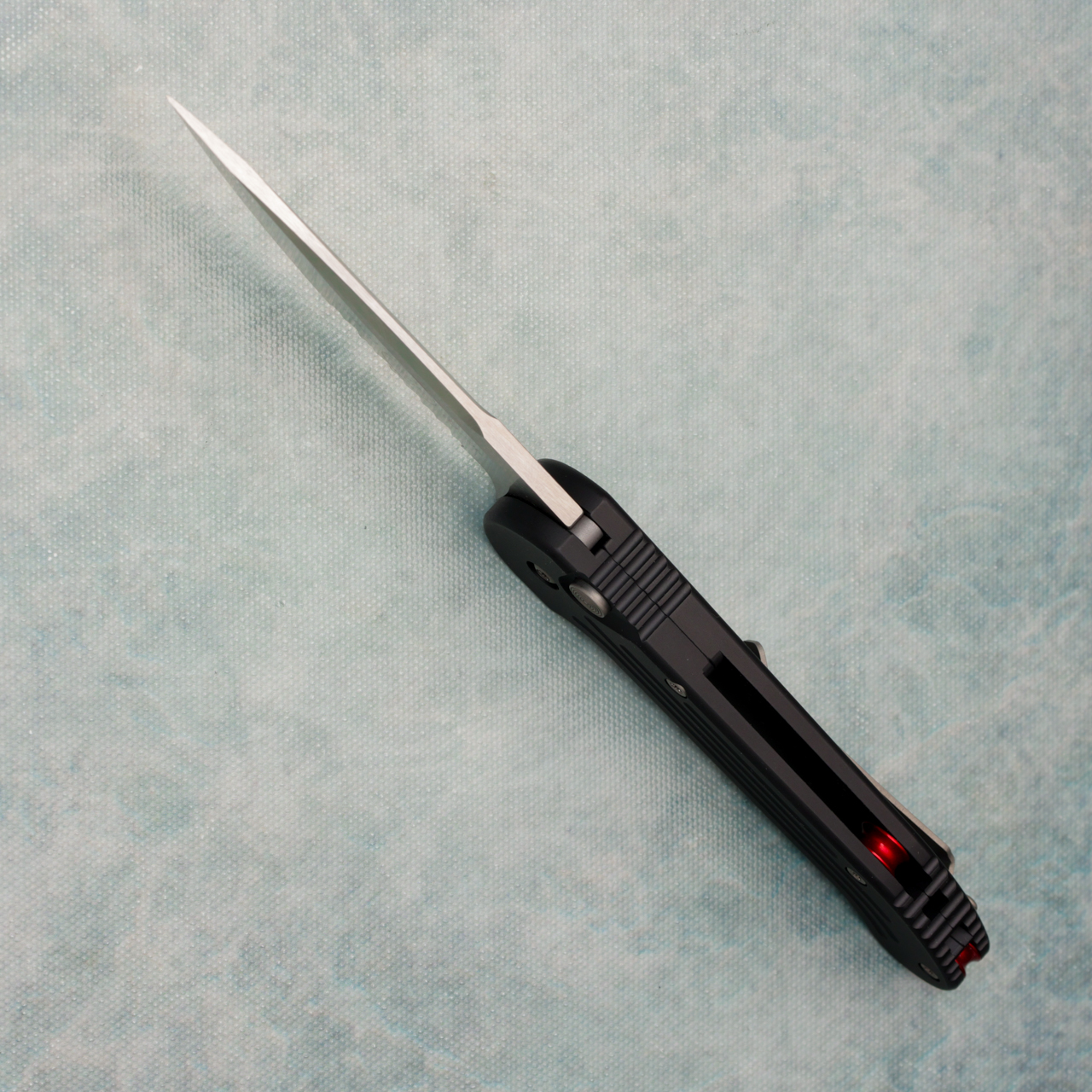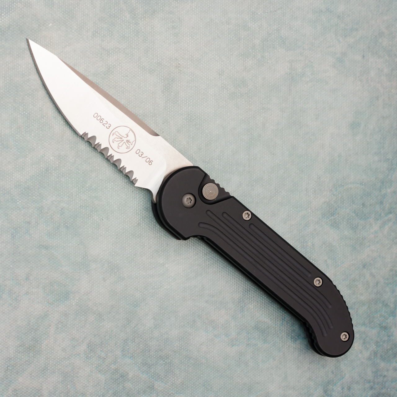 This vintage model black grooved aluminum handles. Satin finished part serrated drop point blade with a standard cutting edge and claw logo. Lanyard hole. Bead blasted torx hardware and pocket clip, red standoffs. The blade is marked with the serial number and Microtech claw logo. This knife was acquired through a collection and is in near mint condition in box. From 3/2006