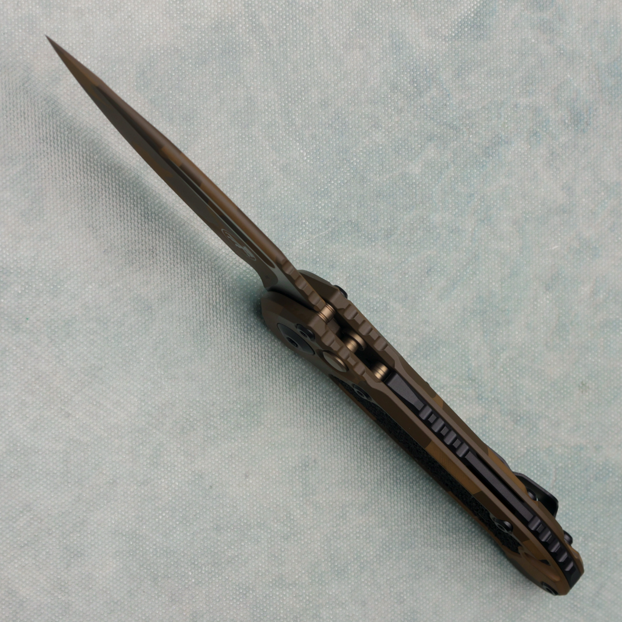 This model features badlands camo certakote 6061-T6 aluminum handle with black 3M grip inlays. Matching finished M390MK stainless steel drop point blade with a standard cutting edge. Torx hardware and tip up pocket clip. The pocket clip is also marked with the Microtech Signature Series logo. Brand new in box.