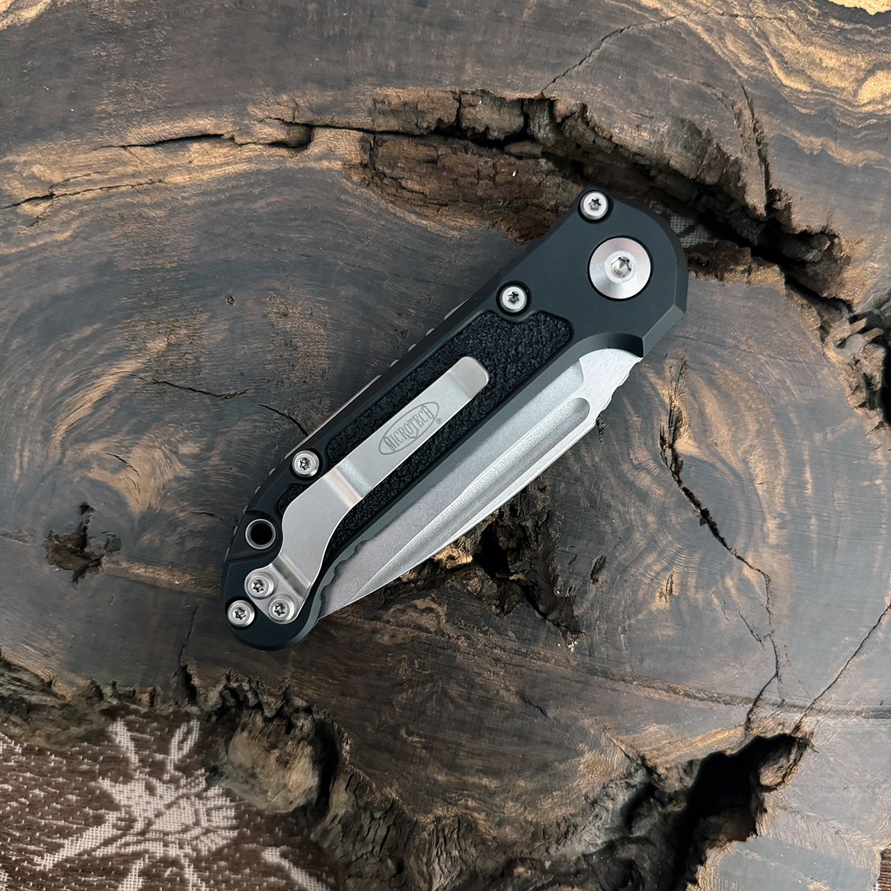 This model features a black anodized 6061-T6 aluminum handle with black 3M grip inlays. Stonewash finished M390MK stainless steel drop point blade with a partially serrated cutting edge. Torx hardware and tip up pocket clip. The blade is marked with the model information and Microtech logo. The pocket clip is also marked with the Microtech logo. Brand new in box.
