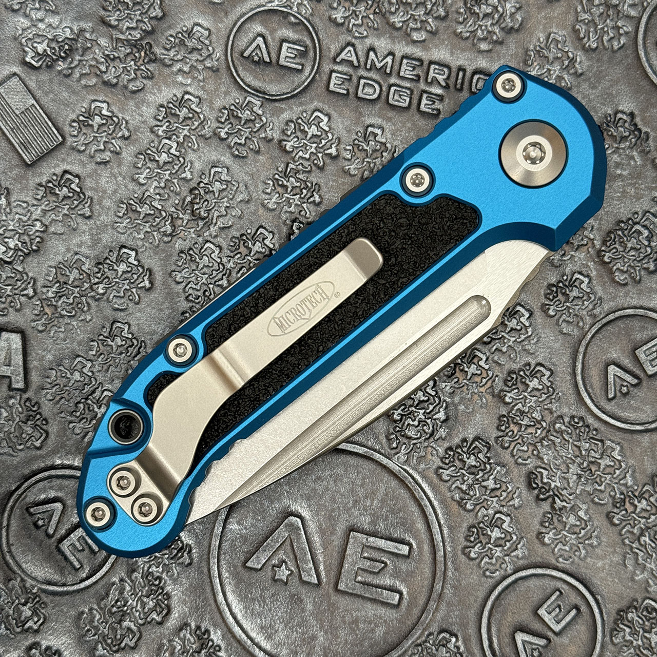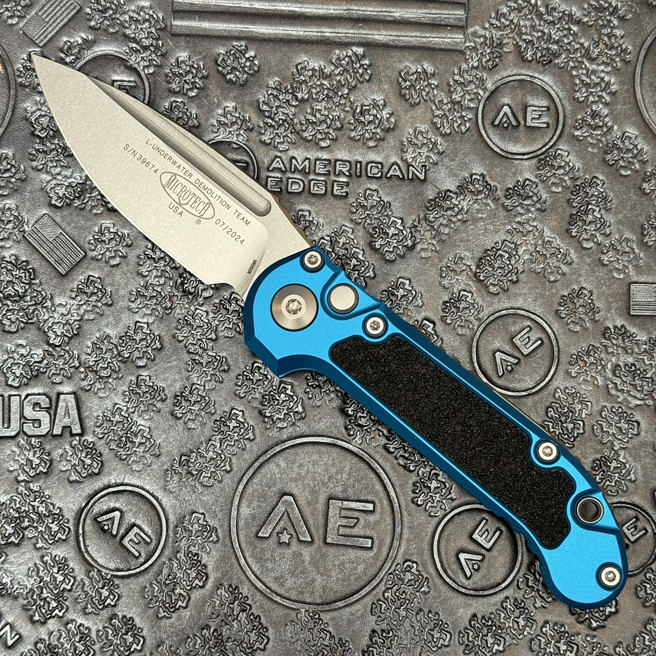 This model features a blue anodized 6061-T6 aluminum handle with black 3M grip inlays. Stonewash finished M390MK stainless steel drop point blade with a standard cutting edge. Torx hardware and tip up pocket clip. The blade is marked with the model information and Microtech logo. The pocket clip is also marked with the Microtech logo. Brand new in box.
