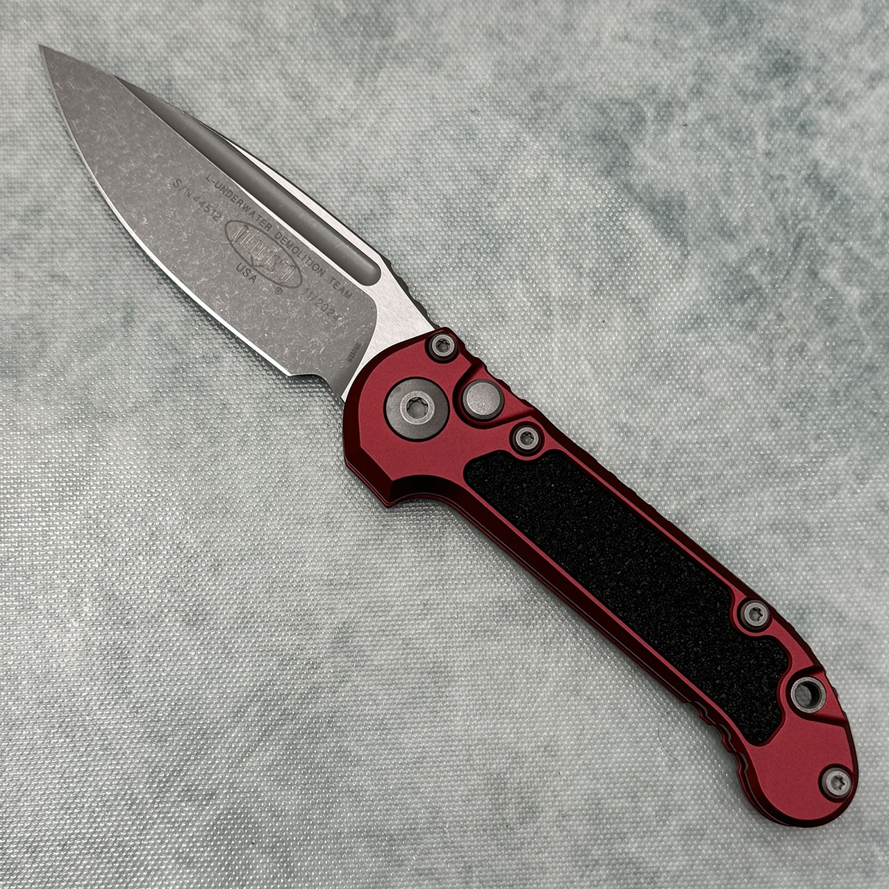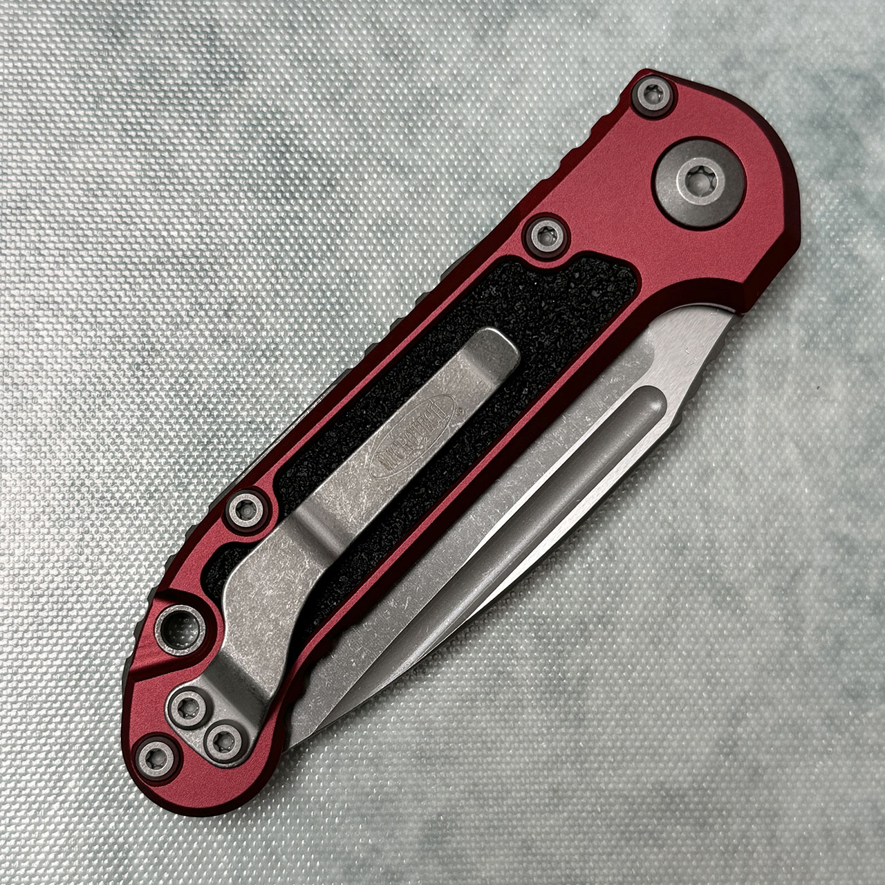 This model features a merlot anodized 6061-T6 aluminum handle with black 3M grip inlays. Apocalyptic finished M390MK stainless steel drop point blade with a standard cutting edge. Torx hardware and tip up pocket clip. The blade is marked with the model information and Microtech logo. The pocket clip is also marked with the Microtech logo. Brand new in box.