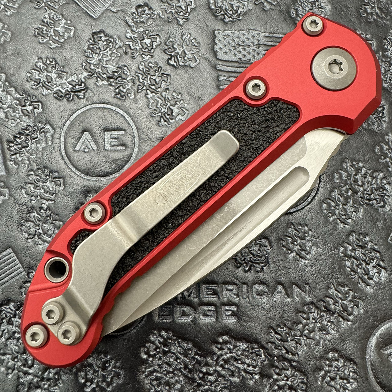 This model features a red anodized 6061-T6 aluminum handle with black 3M grip inlays. Apocalyptic finished M390MK stainless steel drop point partial serrated blade. Torx hardware and tip up pocket clip. The blade is marked with the model information and Microtech logo. The pocket clip is also marked with the Microtech logo. Brand new in box.