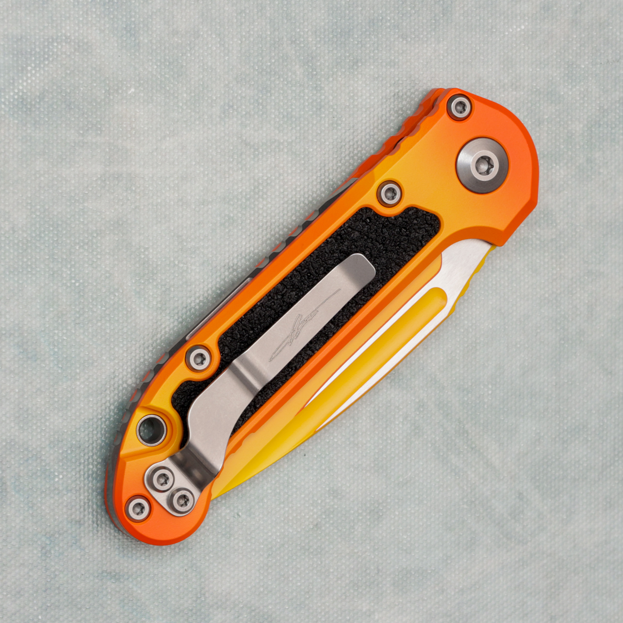 This model features a sunrise 6061-T6 aluminum handle with black 3M grip inlays. Sunrise finished M390MK stainless steel blade with a standard cutting edge. Torx hardware and tip up pocket clip. The blade is marked with the model information and Microtech logo. The pocket clip is also marked with the Microtech logo. Brand new in box.