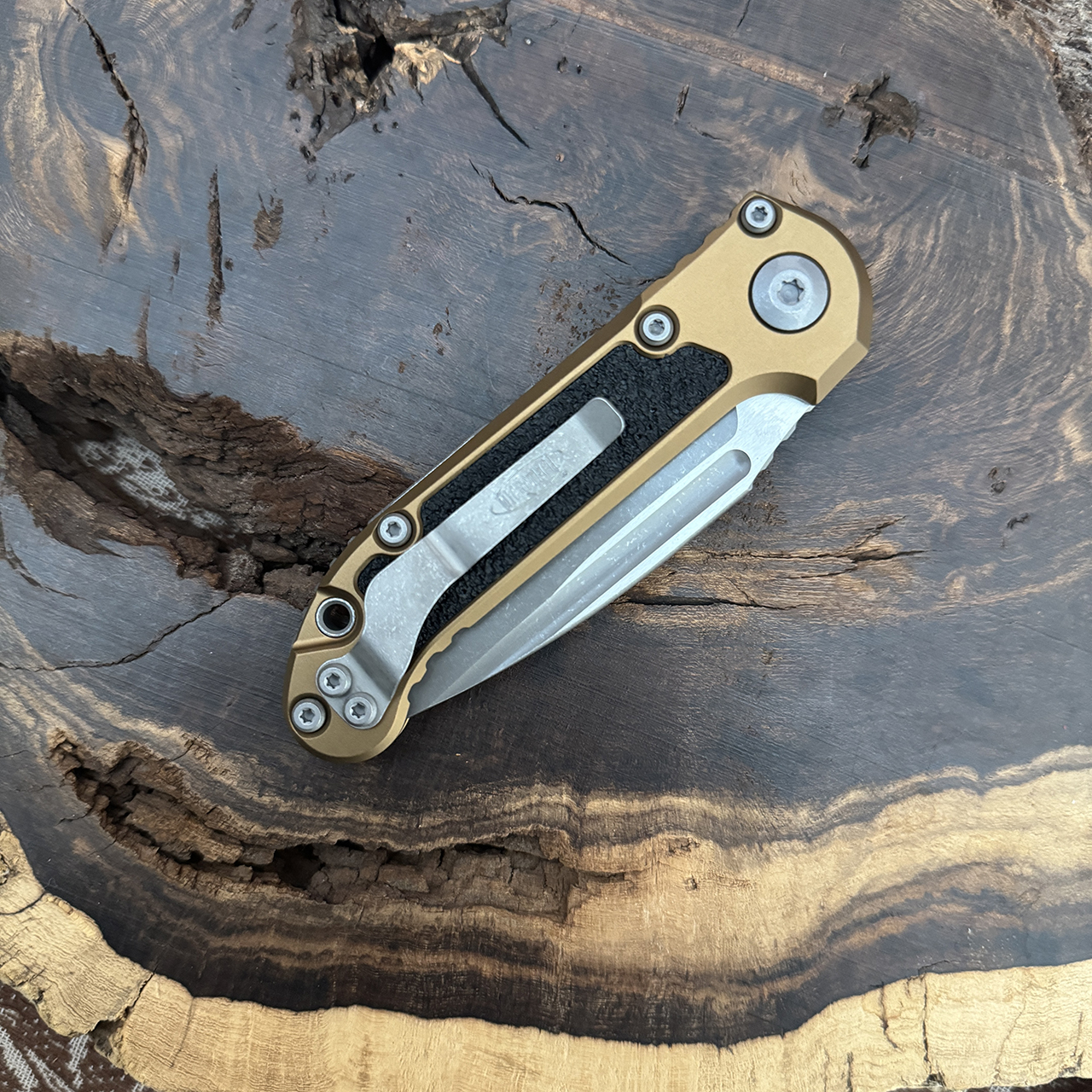 This model features a tan anodized 6061-T6 aluminum handle with black 3M grip inlays. Apocalyptic finished M390MK stainless steel drop point blade with a standard cutting edge. Torx hardware and tip up pocket clip. The blade is marked with the model information and Microtech logo. The pocket clip is also marked with the Microtech logo. Brand new in box.