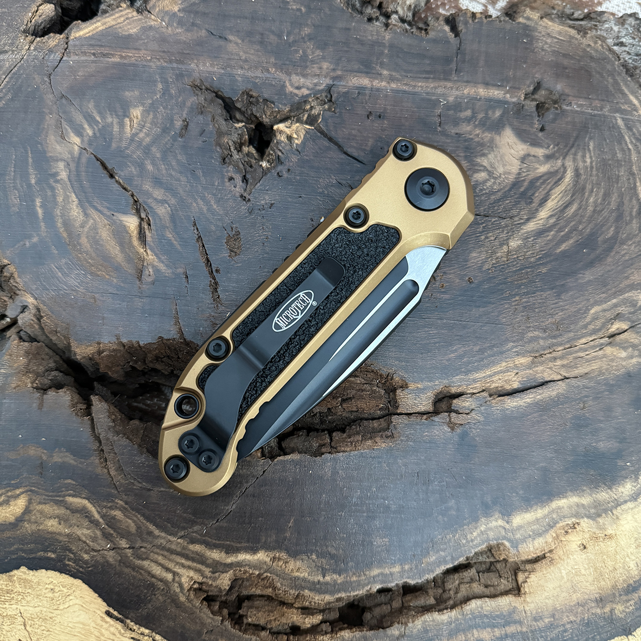 This model features a tan anodized 6061-T6 aluminum handle with black 3M grip inlays. Black finished M390MK stainless steel drop point blade with a standard cutting edge. Torx hardware and tip up pocket clip. The blade is marked with the model information and Microtech logo. The pocket clip is also marked with the Microtech logo. Brand new in box.