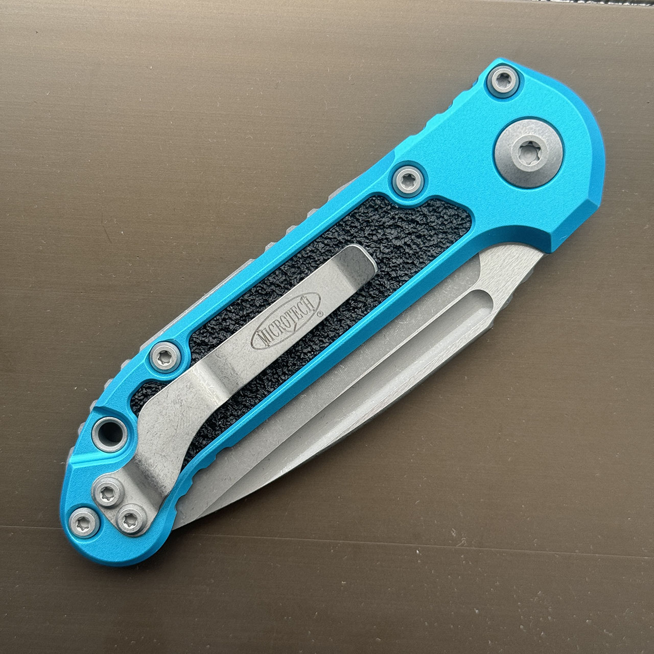 This model features a turquoise anodized 6061-T6 aluminum handle with black 3M grip inlays. Apocalyptic finished M390MK stainless steel drop point blade with a standard cutting edge. Torx hardware and tip up pocket clip. The blade is marked with the model information and Microtech logo. The pocket clip is also marked with the Microtech logo. Brand new in box.