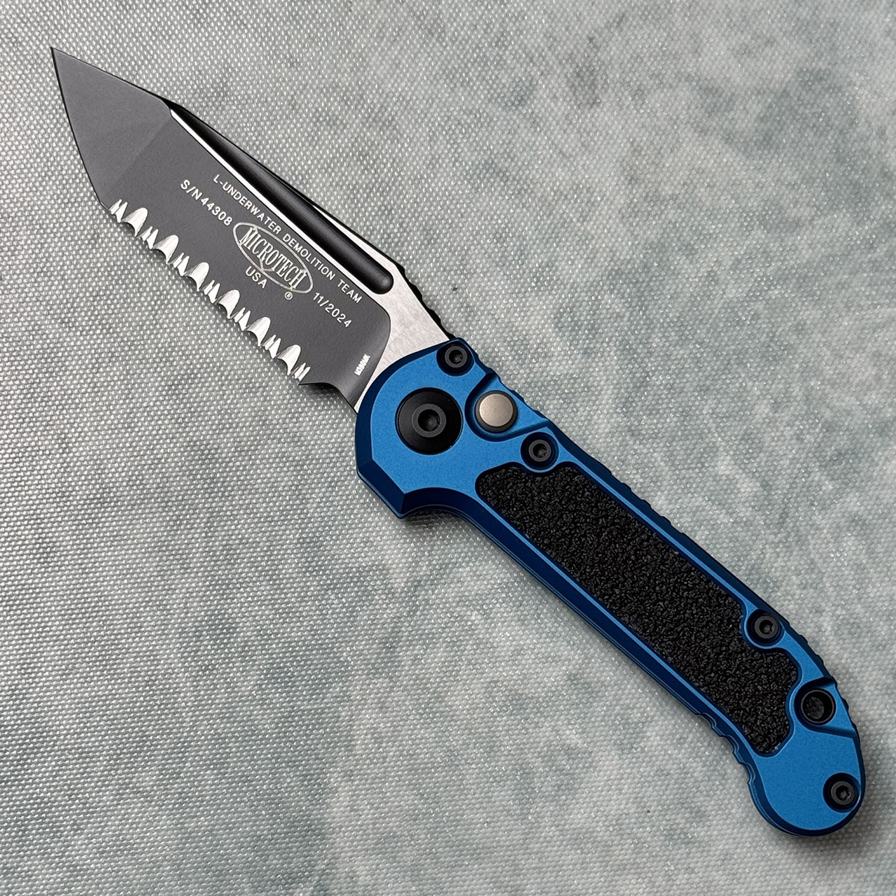This model features a blue aluminum handle with black 3M grip inlays. Black finished M390MK stainless steel tanto blade with a fully serrated cutting edge. Torx hardware and tip up pocket clip. The blade is marked with the model information and Microtech logo. The pocket clip is also marked with the Microtech logo. Brand new in box.