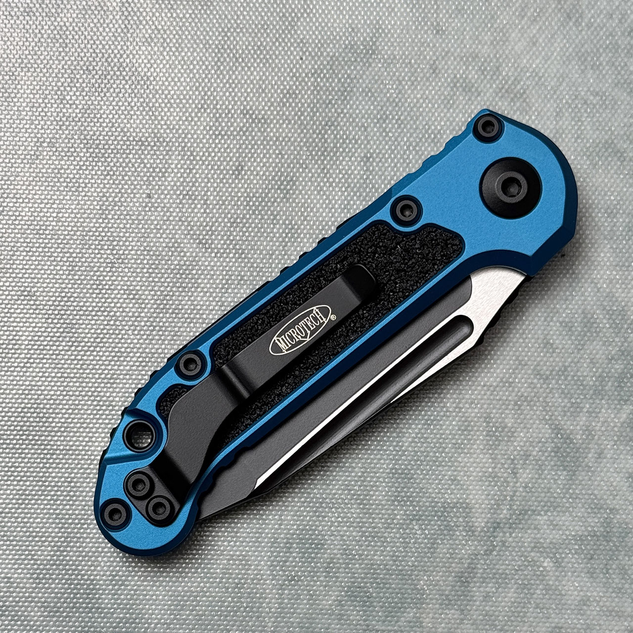 This model features a blue aluminum handle with black 3M grip inlays. Black finished M390MK stainless steel tanto blade with a partially serrated cutting edge. Torx hardware and tip up pocket clip. The blade is marked with the model information and Microtech logo. The pocket clip is also marked with the Microtech logo. Brand new in box.
