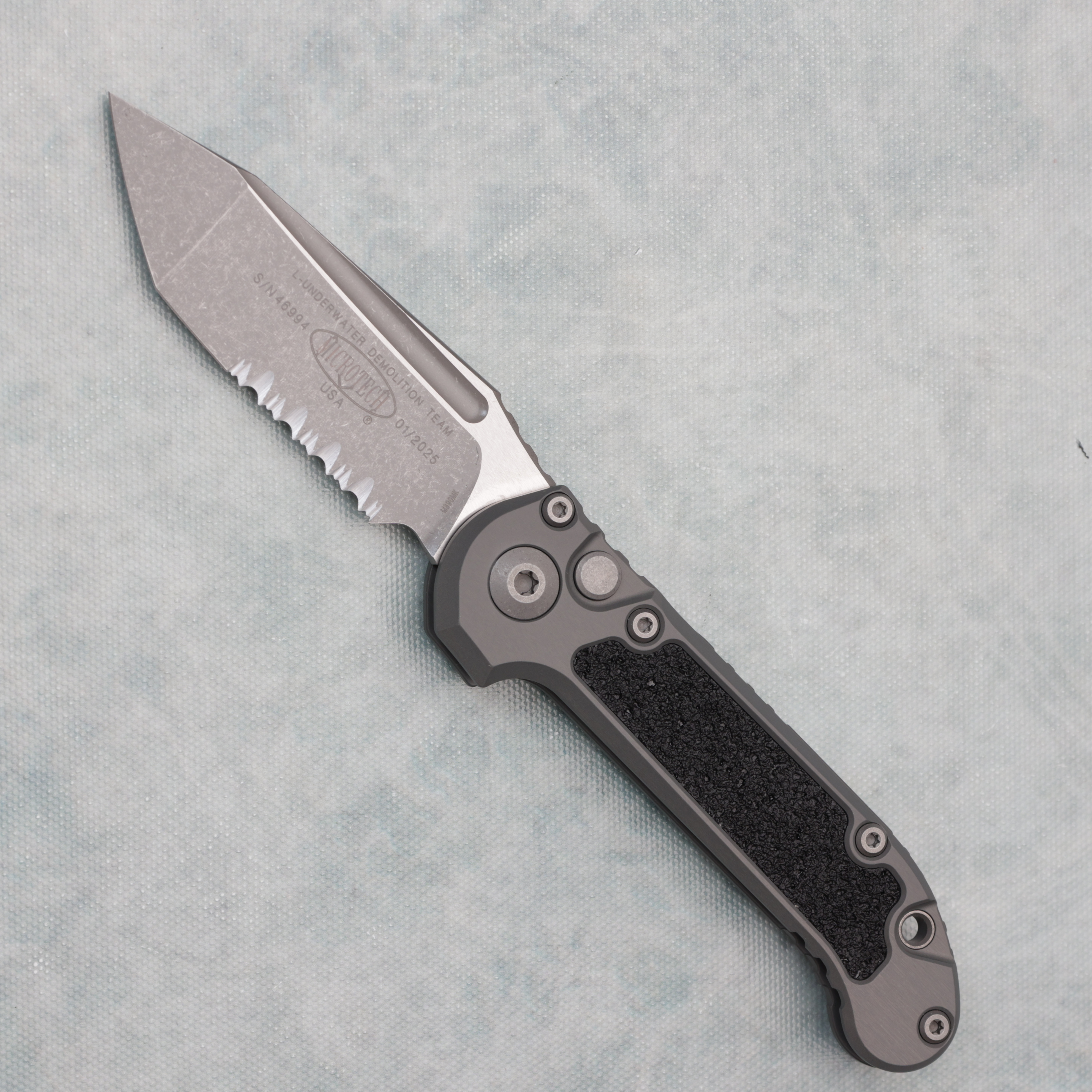 This model features a natural clear anodized 6061-T6 aluminum handle with black 3M grip inlays. Apocalyptic finished M390MK stainless steel tanto blade with a standard cutting edge. Torx hardware and tip up pocket clip. The blade is marked with the model information and Microtech logo. The pocket clip is also marked with the Microtech logo. Brand new in box.